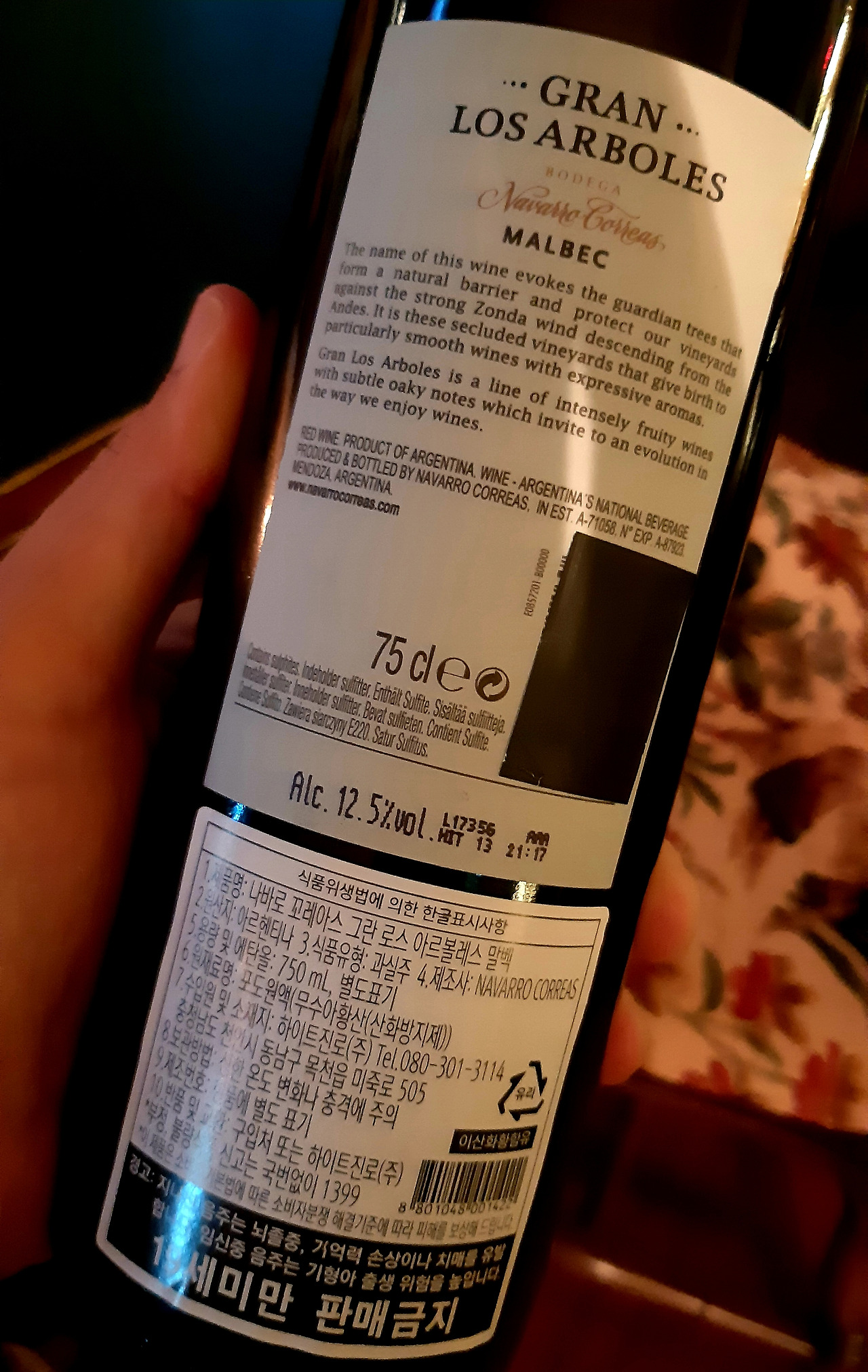 오늘 마신 와인은 처음부터 마지막까지 부드럽다. 말벡도 이렇게 부드러울 수 있다는 걸 배웠다. 메를로 100%만큼은 아니었지만 마시는 내내 부드러운 말벡의 손길을 느낄 수 있었다.