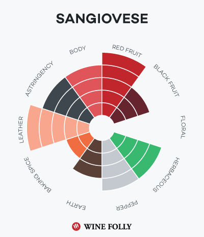 산지오베제는 체리, 구워진 토마토, 오레가노 등의 향이 풍긴다고 한다. 빈티지가 오래될수록 이러한 향은 더욱 짙어진다고 한다.