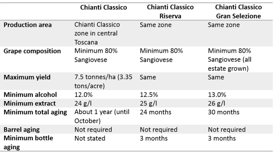재배지역, 포도품종, 알코올농도, 숙성기간 등에 대한 일정한 조건을 지켜야 비로소 끼안티 클라시코에서도 리제르바 또는 그란 셀레치오네를 표기할 수 있다.