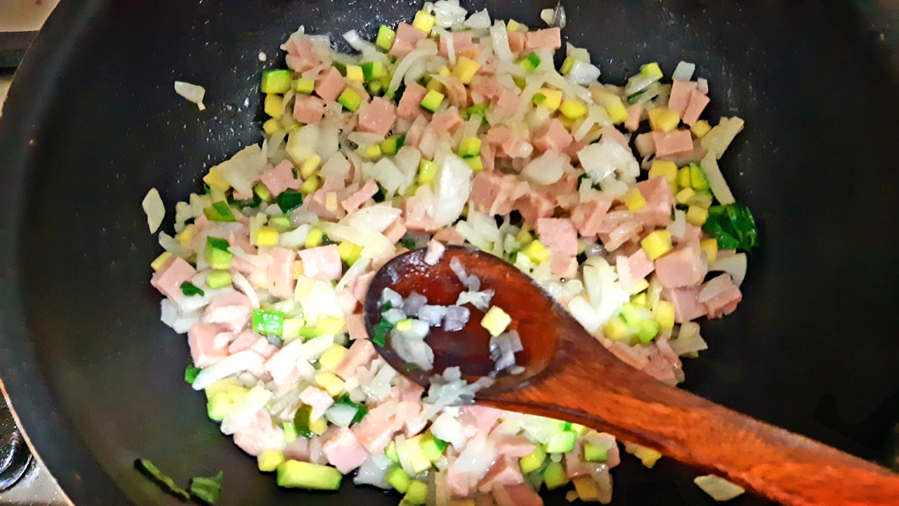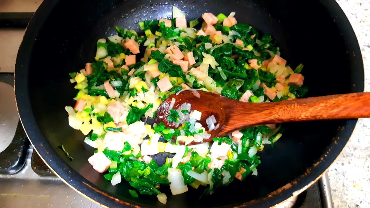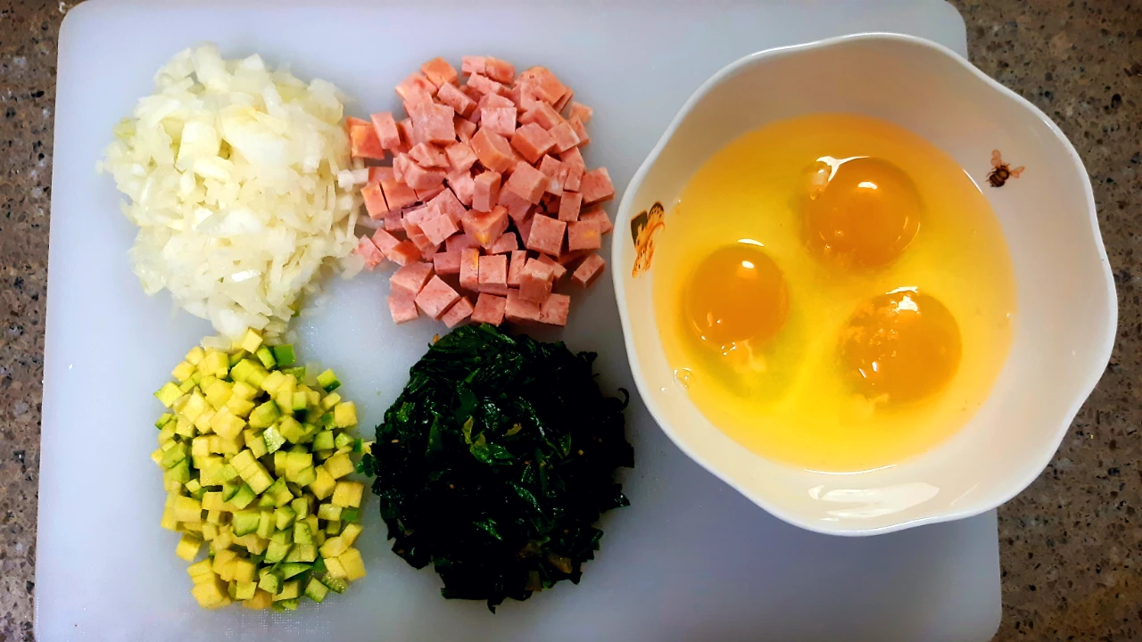준비물 : 양파, 호박, 햄, 시금치, 계란 3개, 소금 약간