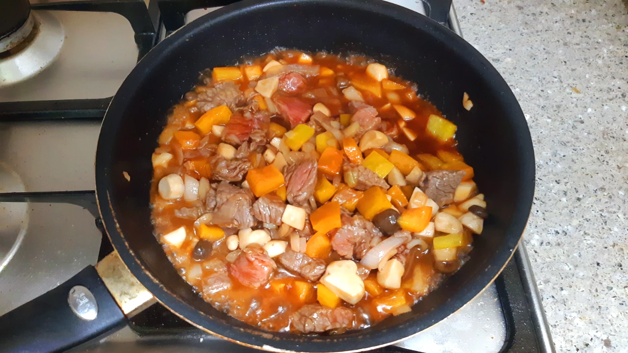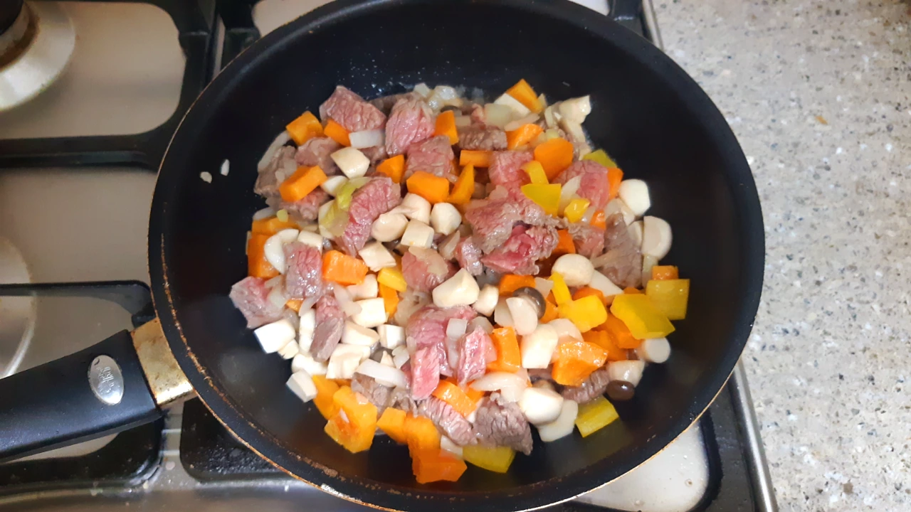 3. 위의 재료 손질에는 깜빡하고 못 찍은 양파 1개를 먹기 좋은 크기로 잘라 후라이팬에 넣어 먼저 볶다가 새송이와 소고기를, 소고기가 미디엄 레어로 익을 즈음 파프리카를 넣는다. 소고기가 너무 익은 뒤에 넣으면 질겨져서다. 그리고 양념을 넣고 중불로 간이 밸 수 있도록 했다.