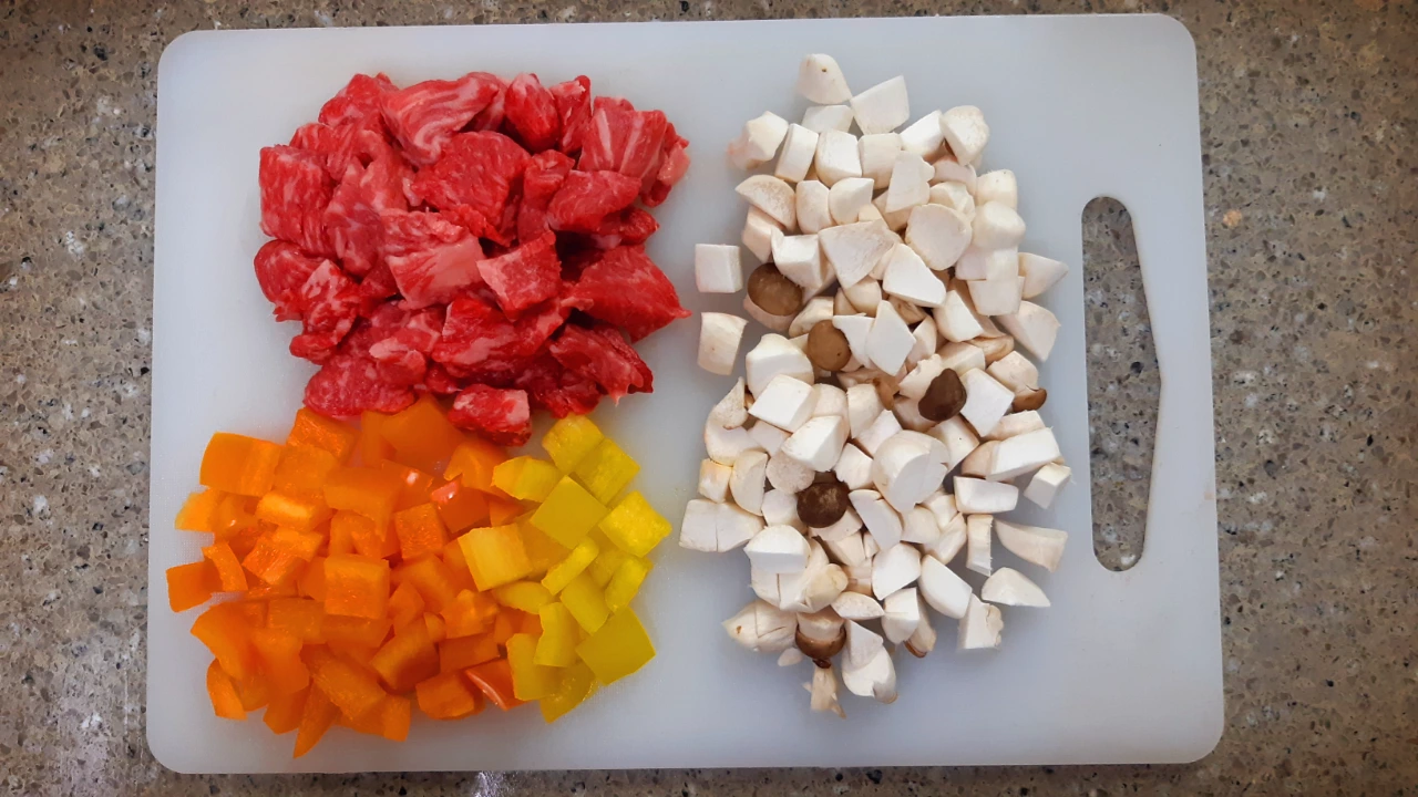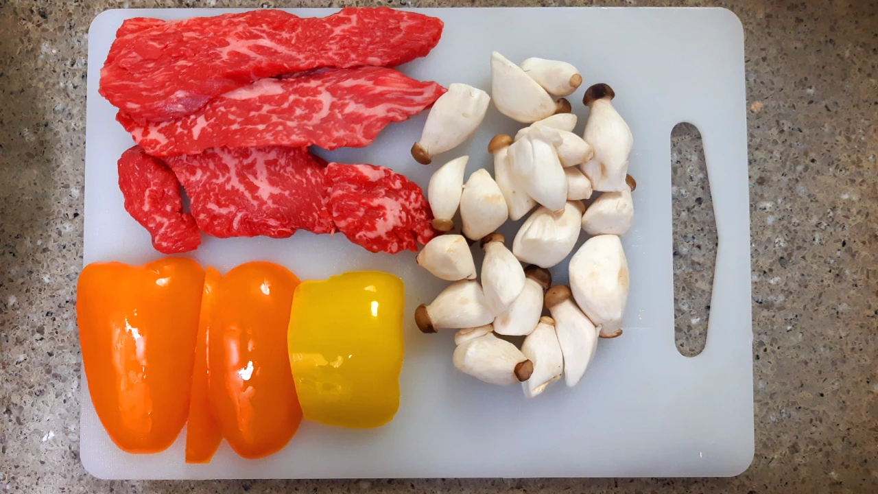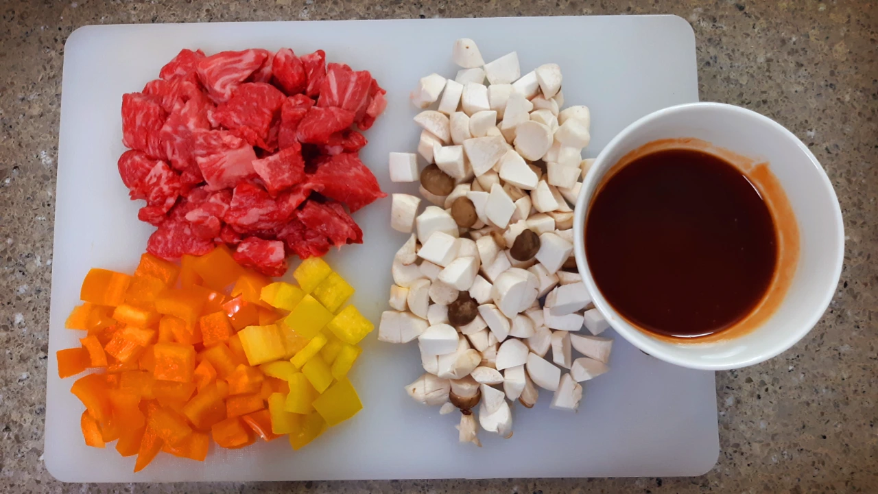 ● 준비물 : 구이용 소고기, 새송이 버섯, 파프리카, 양파, 양념