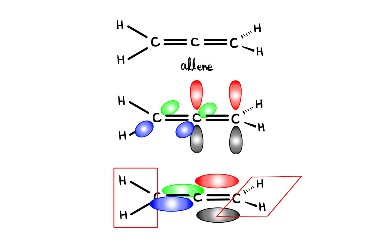 그럼 이중 결합 사이에 단일 결합 없이 이중 결합만으로 연결되어 있다면 왜 conjugation이 되지 않을까? C가 이중 결합만으로 연결된 allene을 통해 알아보자.