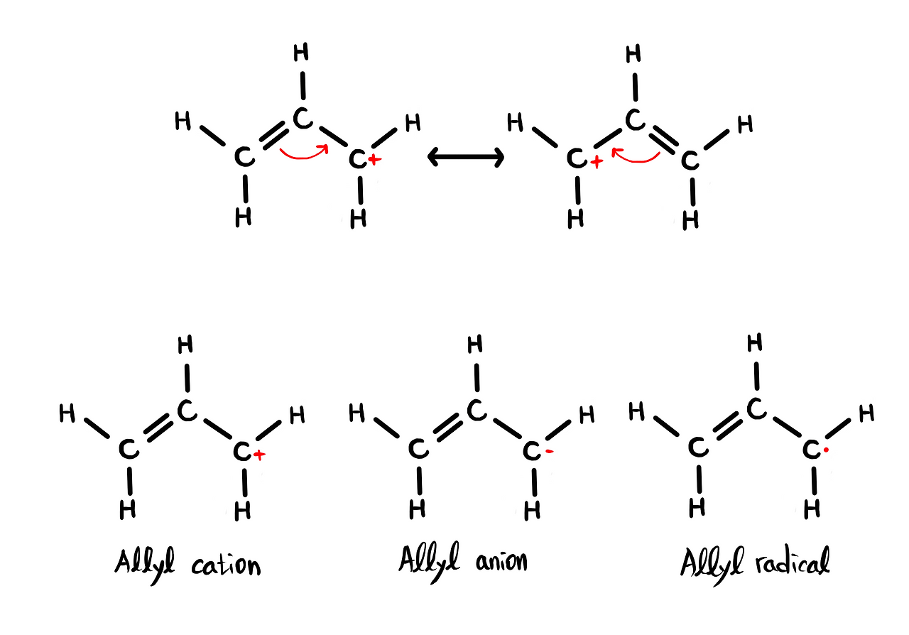 이런 conjugtion 특징을 가지는 funtional group이 있다. 그림과 같이 이중결합과 단일 결합이 이어진 탄소 사슬로 allyl(알릴)이라 한다. 이대로는 conjugation이 되지 않고 단일 결합의 탄소가 cation(양이온), anion(음이온), radical(라디칼) 형태 일 때 conjugation이 된다. 이는 앞서 오존에서 본 형태와 같은 것으로 쉽게 알 수 있다. (혹은 마지막 C에 다중 결합과 결합한다면 conjugation이 된다.)