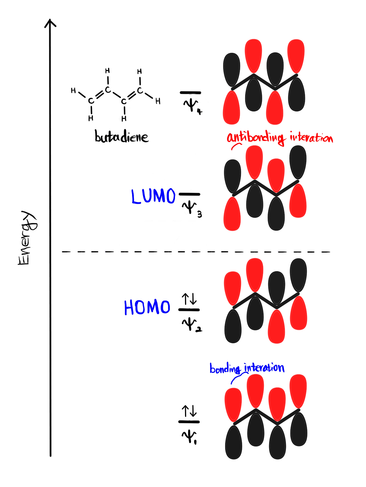butadien은 4개의 pz 오비탈을 가지므로 4개의 분자 오비탈을 형성하며, 2개의 bonding MO와 2개의 antibonding MO를 형성한다.