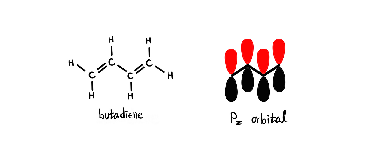 앞서 내용으로 공명 구조를 가지는 분자의 특징을 말할 수 있을 것이다. 구조식에서 다중 결합 또는 비공유 전자쌍, 라디칼이 단일 결합을 사이에 두고 반복되면 공명 구조를 가지게 된다. 그림 12의 butadiene을 보면 조금 더 쉽게 다가올 것이다. 이와 같은 구조를 가진 분자는 그림과 같이 p 오비탈이 나란히 존재한다.