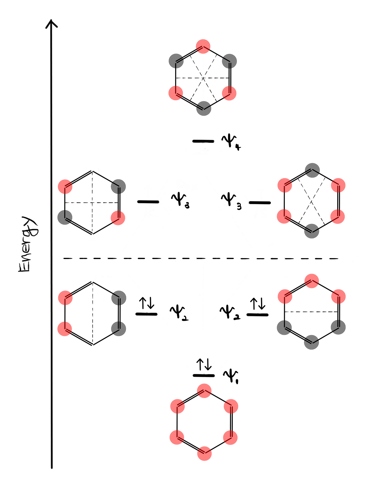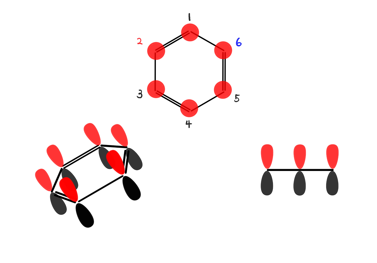 benzene의 pz 오비탈(π-전자) 다이어그램을 나타내면 그림 17과 같다. 6개의 pz 오비탈이 6개의 분자 오비탈을 형성한다. 자세히 보면 3개의 bonding MO과 3개의 antibonding MO를 형성한다. 같은 부호(색)끼리 상호작용 할수록 낮은 에너지를, 다른 부호끼리 상호작용 할수록 마디 수가 늘어나며, 높은 에너지에 위치하게 된다.