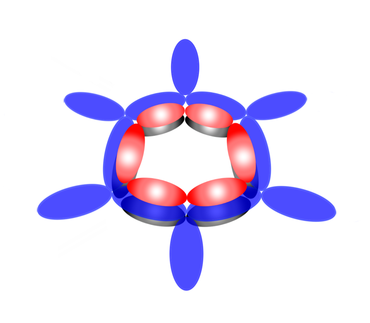 왜 이런 의문이 드는지 다음과 같이 결합을 오비탈로 표현해보면 느낄 수 있을 것이다. VBT의 전자쌍 결합으로 본다면 그림 4와 같이 6개 C(탄소)의 pz 오비탈이 이중 결합 3개를 이루고 있다는 걸 볼 수 있다. 이는 육각형이 있는 평면 위아래로 이루고 있는 π-bond(빨간색과 검은색)를 보여준다.