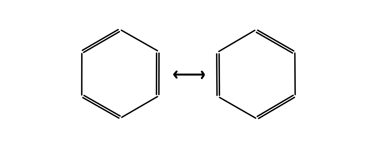 이와 같이 benzene과 오존은 lewis 구조식으로 정확하게 나타낼 수 없다. 앞의 글에서 이야기한 octet과 형식 전하에도 문제가 없으나 실제 구조를 나타낼 수 없다. 이를 보완하기 위해 동등한 구조식들을 이중 화살표로 표기하여 그 중간인 구조를 나타내고자 한 것이 공명 구조이다.