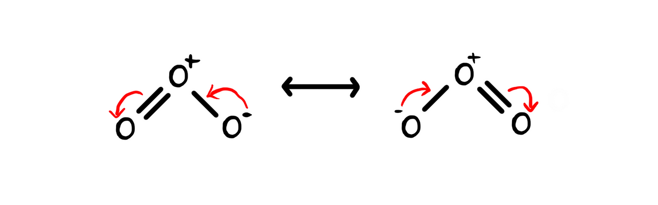 오존의 구조는 그림 10과 같이 2개의 공명 구조를 가진다. 여기서는 benzene과 같이 단일 결합과 이중결합이 반복되지 않는다. 그러나 비공유 전자쌍이 이중결합의 π전자의 역할을 함으로써 공명 구조를 가진다.