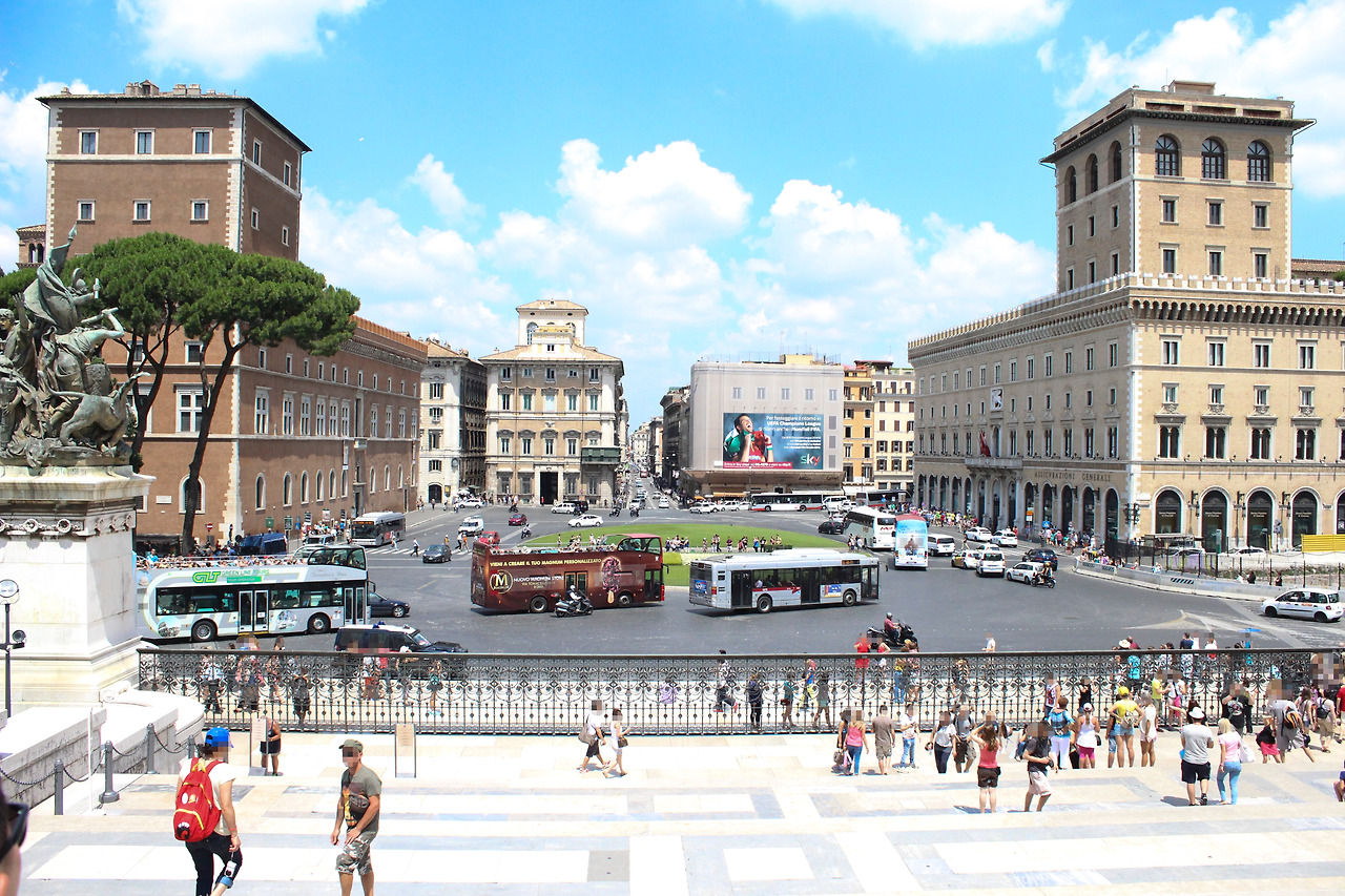 계단을 내려가 대로에 들어서면 베네치아 광장 (Piazza Venezia)을 볼 수 있어. 여기는 사람의 광장이라기보다는 로마의 도로가 모이는 중심지 같은 곳이야.