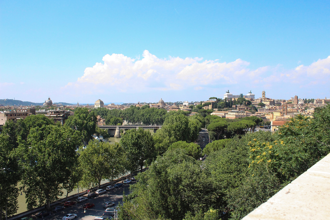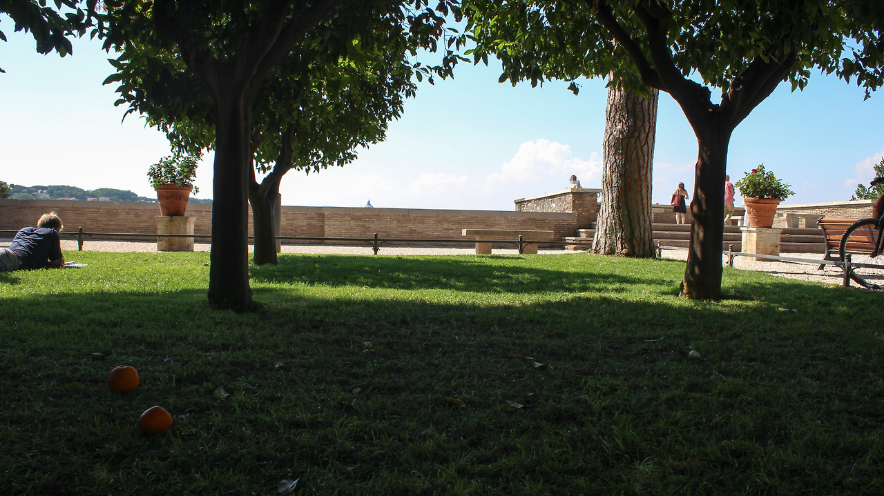 '덥다 더워'를 반복하며 도착했더니 생각보다 조그만 공원이었어. 하지만 오렌지 나무로 된 공원이라 여러 향이 나서 산뜻했지. 우선테라스로 가서 로마를 구경했어. 높은 언덕이니 만큼 우리가 걸어왔던 곳들이 보였어. 그리고 곧 구경 갈 바티칸도 보였지. 관광객들이 많아서 그곳에서 오래 서 있을 순 없었어. 다른 분들도 사진을 찍어야 할 풍경이니까.