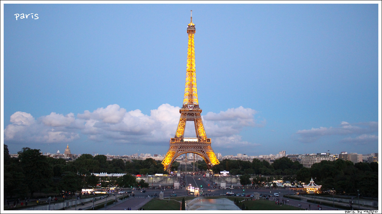 게하에서 조금 쉬다가 해 질 무렵 나왔어. 밤의 에펠탑을 보기 위해서 샤요 궁으로 향했지. 이곳에서 에펠탑 사진을 찍으면 와우! 할 수 있거든. 이곳에는 에펠탑 열쇠고리를 파는 아저씨들이 많아. 특히 한국말하는 흑인 아저씨들이 있었어. 말만 잘하면 엄청 깎아줘.^^
