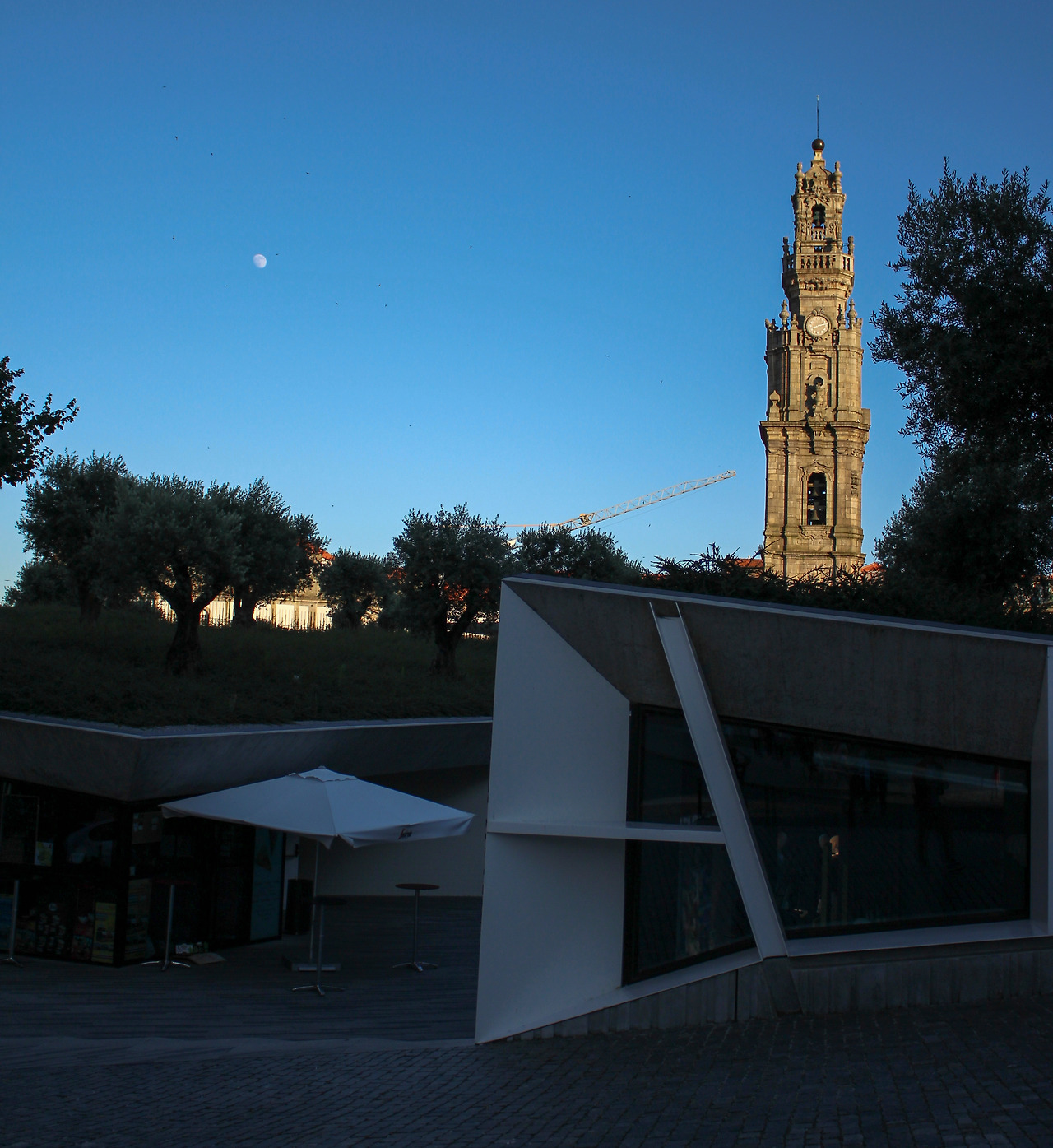 그 앞에 멋진 건물이 있어. 오르막길에 반쯤 묻힌 건물로 포르투 도서관이야. 역시나 사람이 없어. 위쪽에는 상가들이 있고 상가 위에는 공원으로 꾸며져 있어. 높은 곳에서 본다면 도서관은 보이지 않고 공원만 있는 것처럼 보여. 거기에 B612에 있을 거 같은 키 작은 바오밥나무처럼 생긴 나무가 있었어. 물론 아니지만. 그곳에서 나무와 종탑 그리고 달을 보고 있으니 몽환적이더라. 뭔가 감상에 빠져버렸어. 역시 도서관이 좋아(?)
