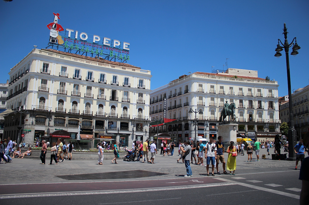 이곳의 상징은 마드리드라는 명칭의 유래에 관련된 곰과 마드로뇨 동상보다도 Tio pepe 광고판이야. '마드리드와 큰 관련이 있나 보다'라고 생각했는데, 일반적인 셰리 브랜드 광고야. 한편으로는 이해가 가는 게 광장에서 이 광고판이 가장 눈에 띄고 기억에 남아. 더욱이 유일한 대형 네온사인인 데다 이곳에 70년간 있었다고 하니 상징이 되겠지. 한때 자본주의의 원리에 의해 사라졌지만 시민들의 요청에 의해 다시 돌아왔다고 해.