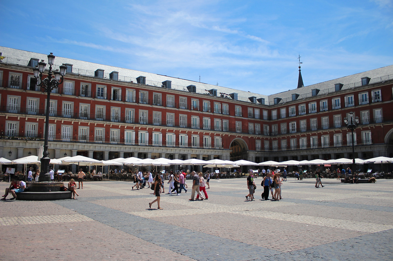 더욱이 4면을 감싸고 있는 건물이 정면의 옛 시청사 말고는 모두 붉은색의 같은 높이의 건물이라 그런 인상을 강하게 했어. 광장이 좌우 대칭을 이루는 곳은 많았아도, 직사각형의 광장을 프렉탈 구조처럼 반복적으로 구성한 곳은 처음이었던 거 같아서 신기했지. 이과생이라 그런가. 자유로운 걸 좋아하긴 하지만 리스본에서도 말했든 이런 편안함을 느낄 정도로 딱 들어맞는 광장이라 재밌었어. 마드리드의 모든 행사가 이곳에서 열렸다고 하니, 백성들에게 이런 '룰을 지키고 정확한 왕가라는 인상을 줄려고 했던 목적도 있지 않았을까' 하는 조심스러운 추측도 해봤어.