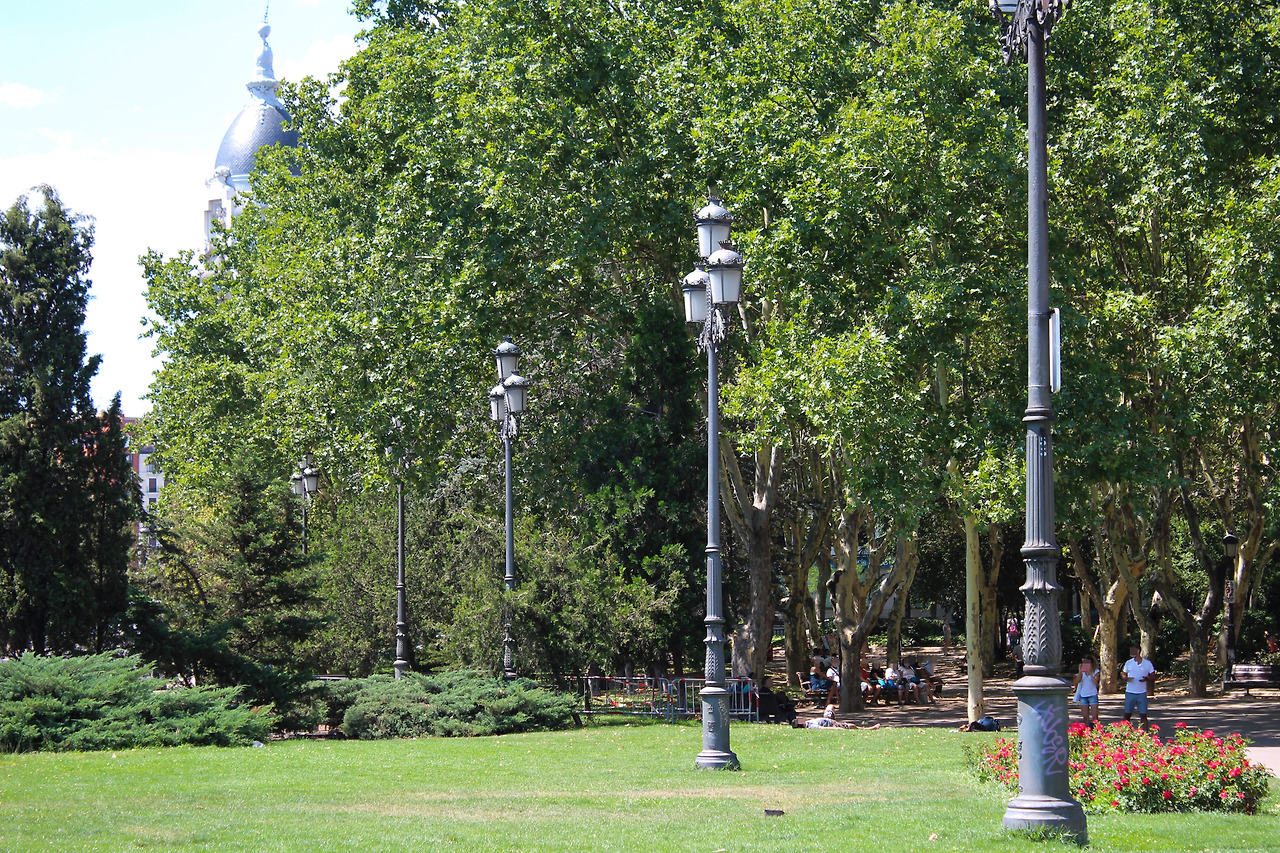 로비에서 쉬는 동안 더위도 조금 가신 거 같고 햇볕도 조금 약해진 거 같았어. 그래도 멀리 가지 않으니 결국 아까 갔던 곳들을 재방문할 뿐이었어. 걸어가다 그늘 나오면 쉬고 공원 큰 나무 밑에서 쉬다 보니 해가 어느 정도 넘어가고 구름도 많아졌어. 그래서 구름과 건물에 가려 그늘이 생기기 시작했어. 그러니 구경하기 훨씬 편해졌고, 덕분에 마드리드의 풍경이 보였어. 그렇게 보이는 황금빛 마드리드는 꽤 멋있었어.