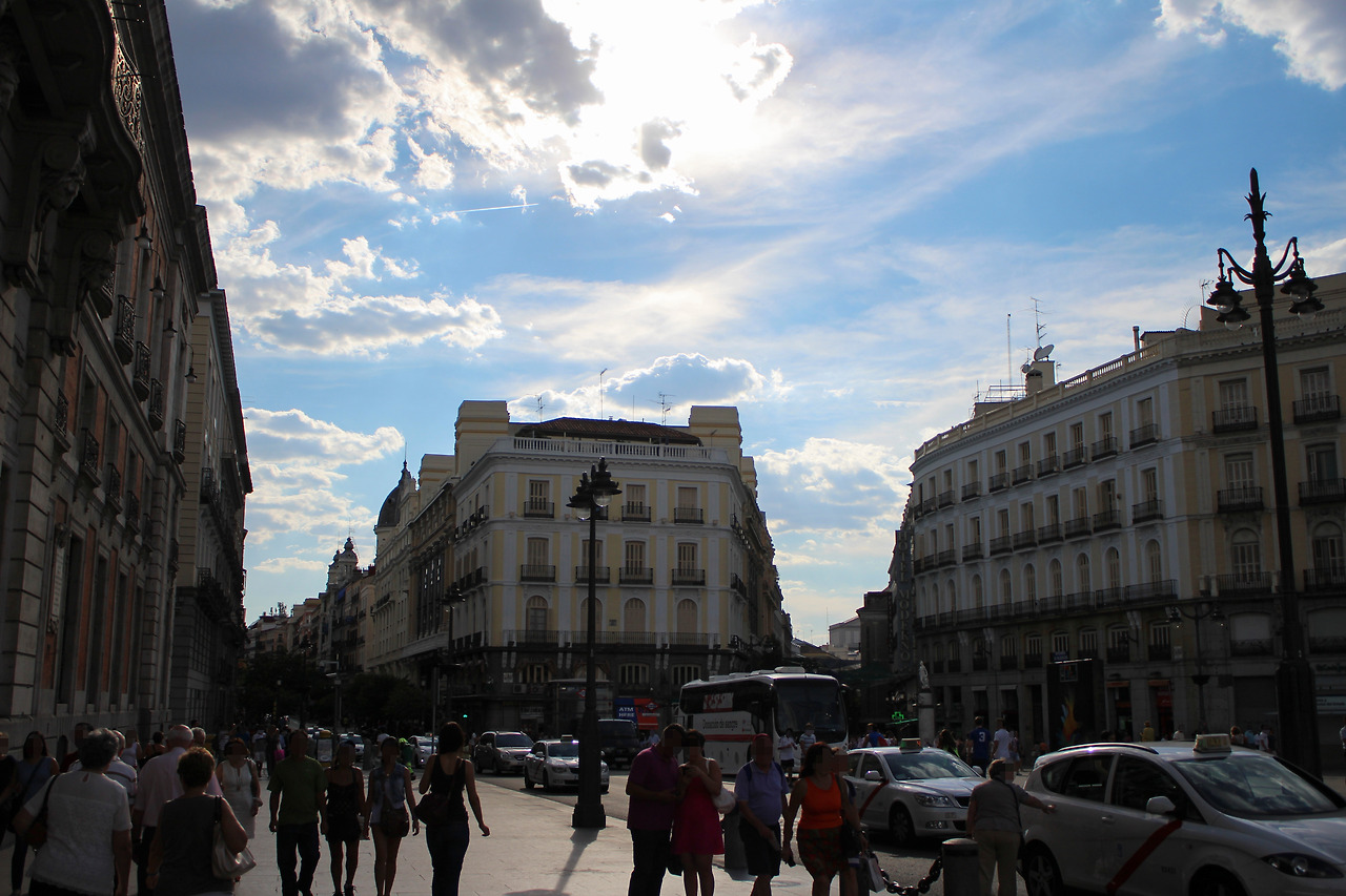 마요르 광장을 나와, 걷던 거리를 걸으면 마드리드의 상징 같은 솔 광장이 나와. 스페인에 며칠 있었다고 솔이라는 단어는 느낌상 썬이라는 걸 알았어. 태양의 문이라는 이름 그대로 광장이 마치 해수면에서 떠오르는 태양같이 반원으로 생겼어. 그리고 햇살처럼 길이 쭉쭉 뻗어 있지. 가운데에는 카를로스 3세의 동상으로 마드리드 중심이 솔 광장으로 바뀌었다는 걸 알 수 있었어. 10개의 길이 있기 때문에 사람이 엄청 많았지.