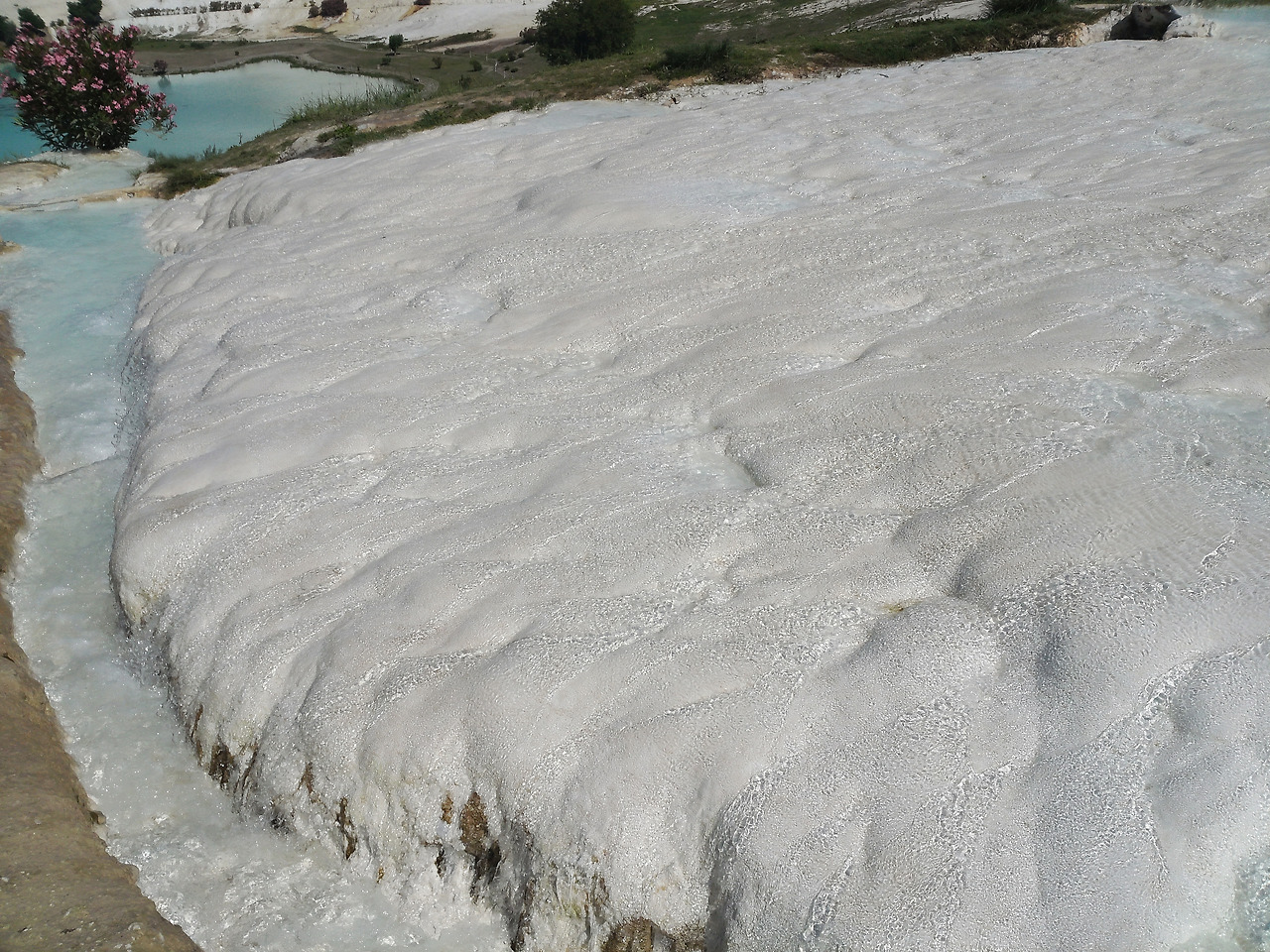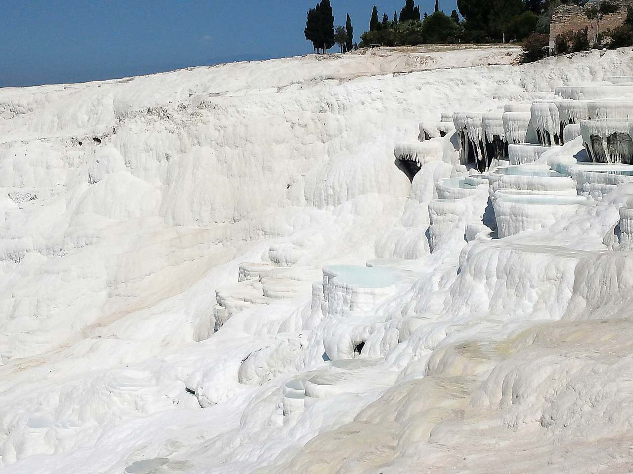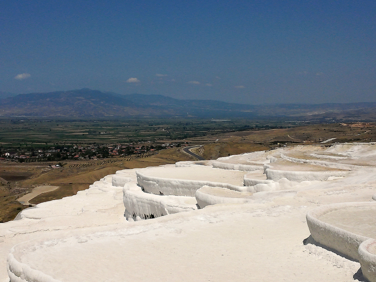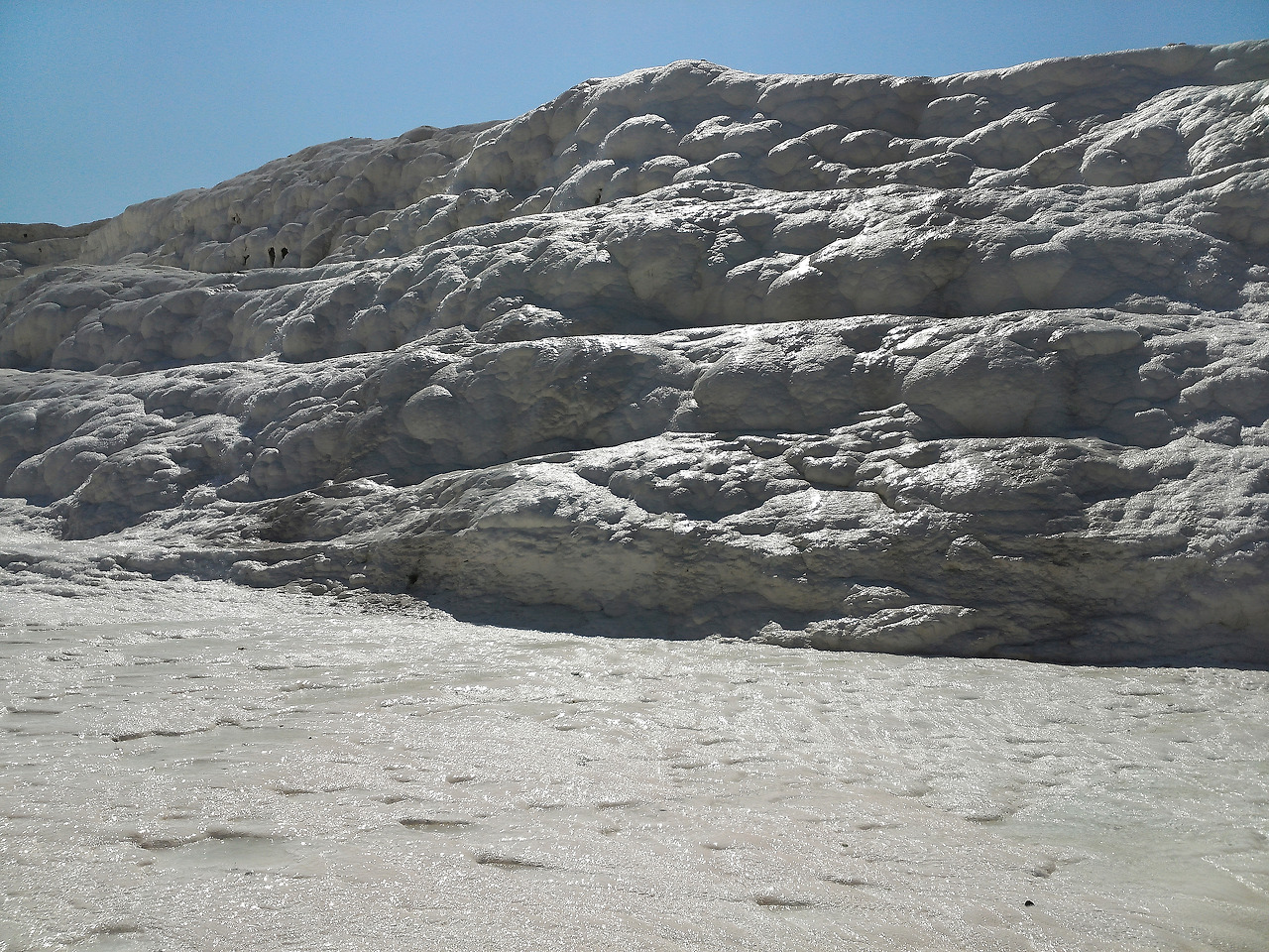 파묵칼레의 뜻은 목화성. 난 소금 성으로 생각했지만 고대 사람들은 하얀색을 목화라고 생각했나 봐. 하얀 부분은 실제로 석회. 석회는 따뜻한 지하수에 포함되어 있었고, 오랜 시간 산을 따라 흘러내리면서 산을 덮어버려 하얀 산으로 만들어버린 거였어. 초등학생 때 단층을 배웠을 거야. 땅속 힘으로 인해 땅이 일정한 모양으로 형성된다는 것. 계단식 논처럼, 여러 개의 우물처럼 생긴 원인이지. 즉 황토색 배경에 층 무늬를 가진 캔버스에다 하얀 물감을 칠하고 덧 칠해서 파묵칼레가 된 거였어.