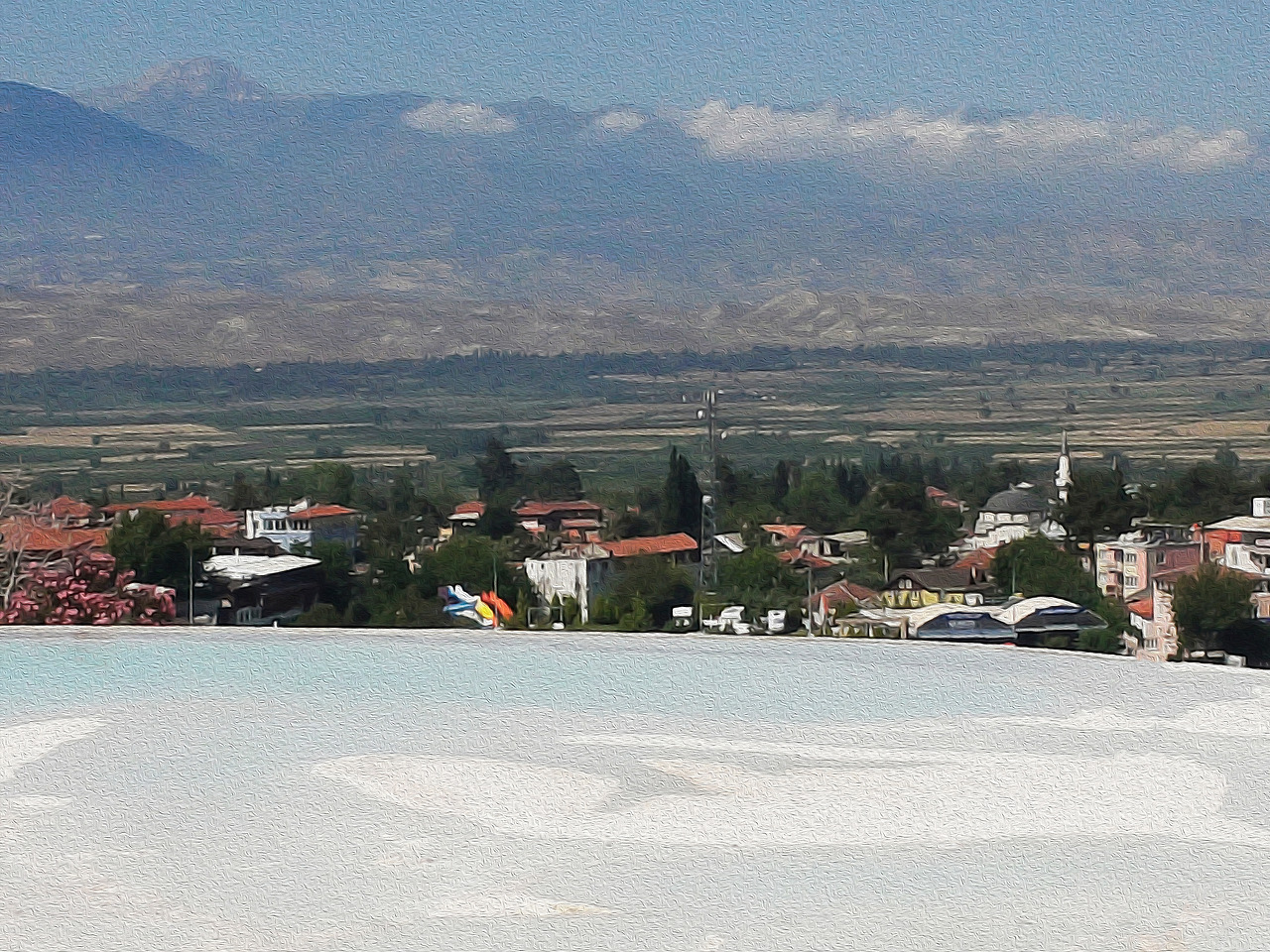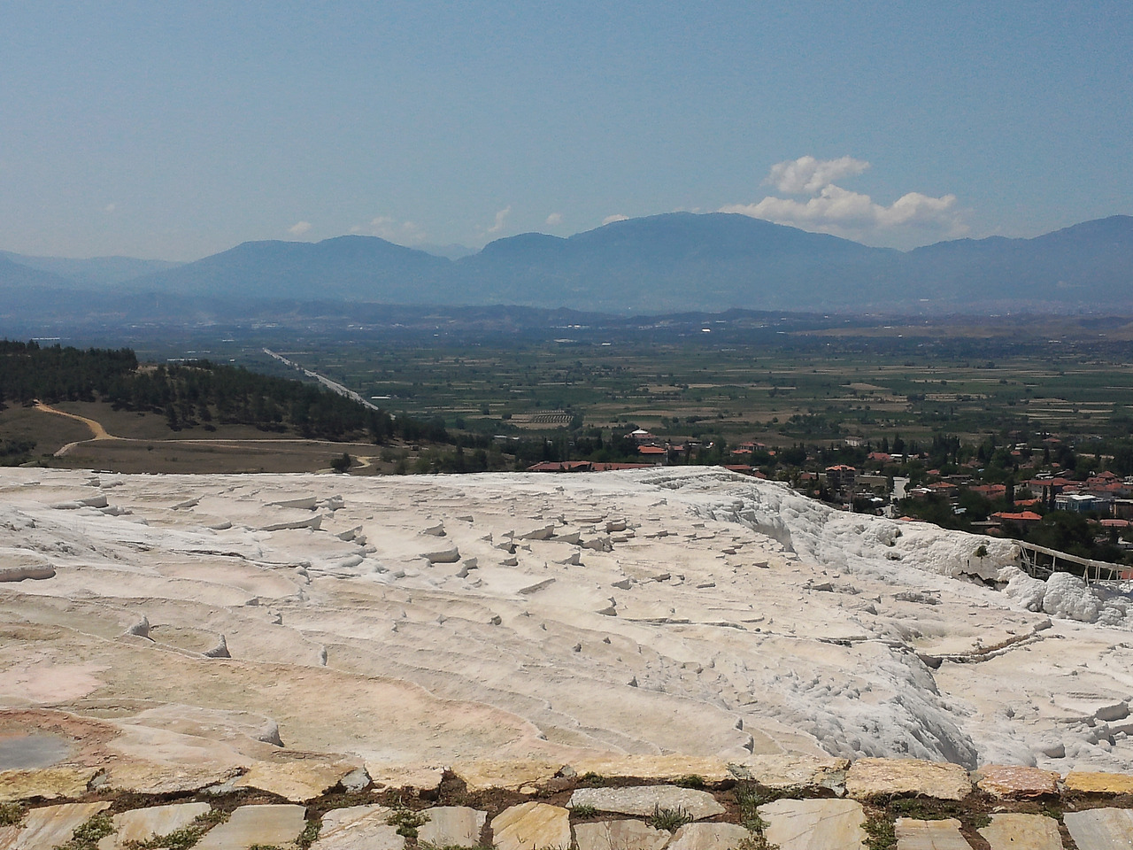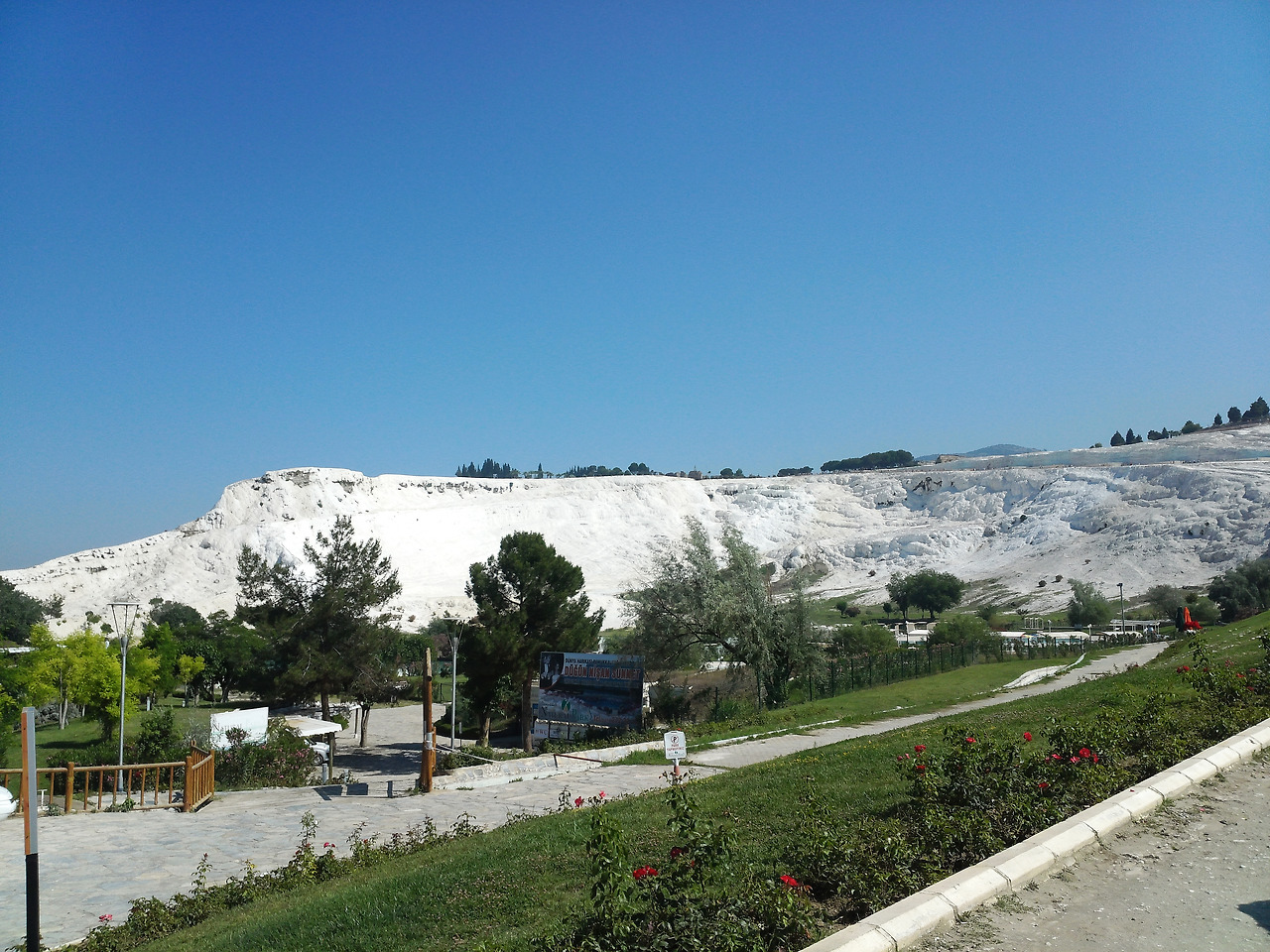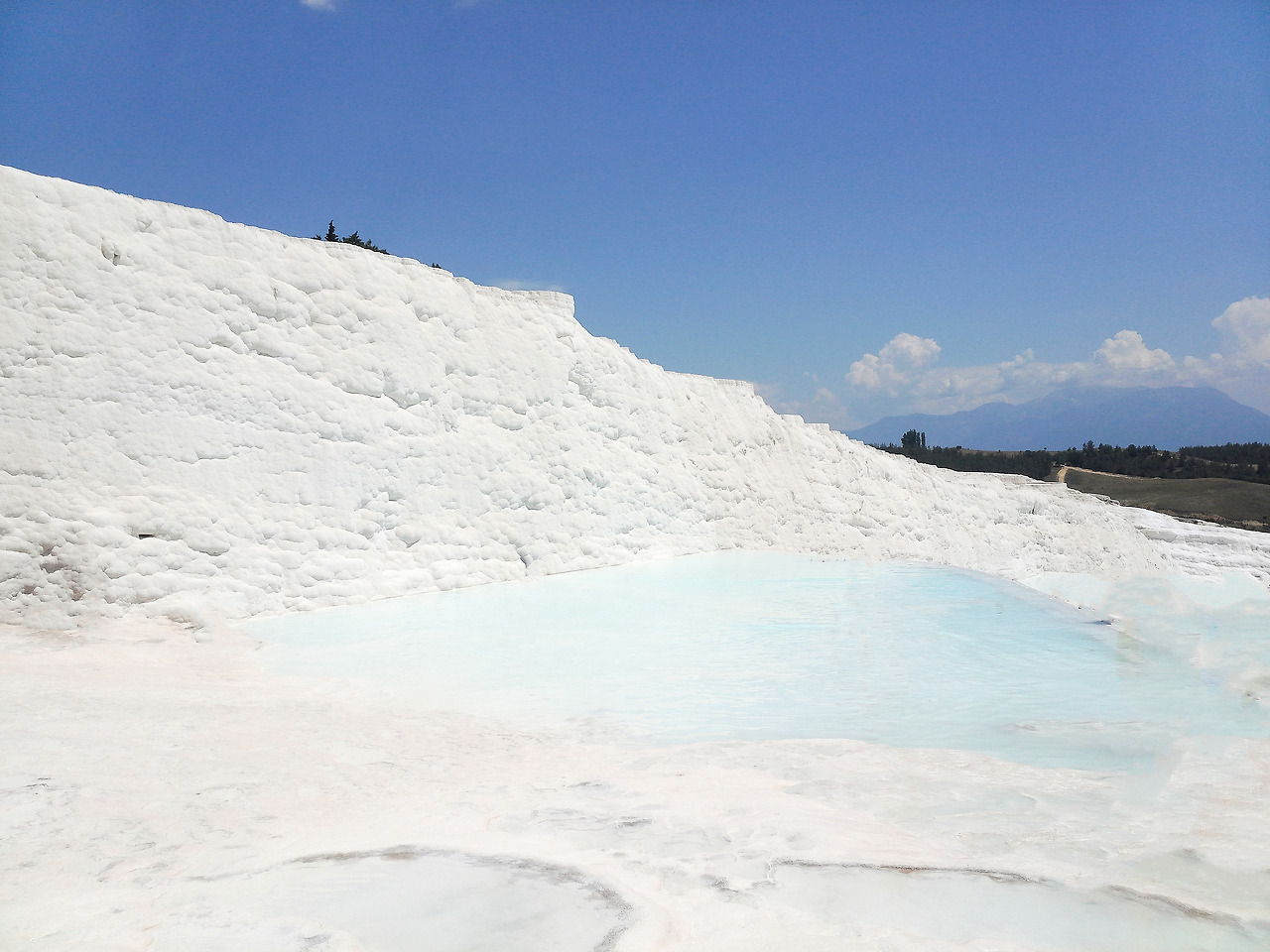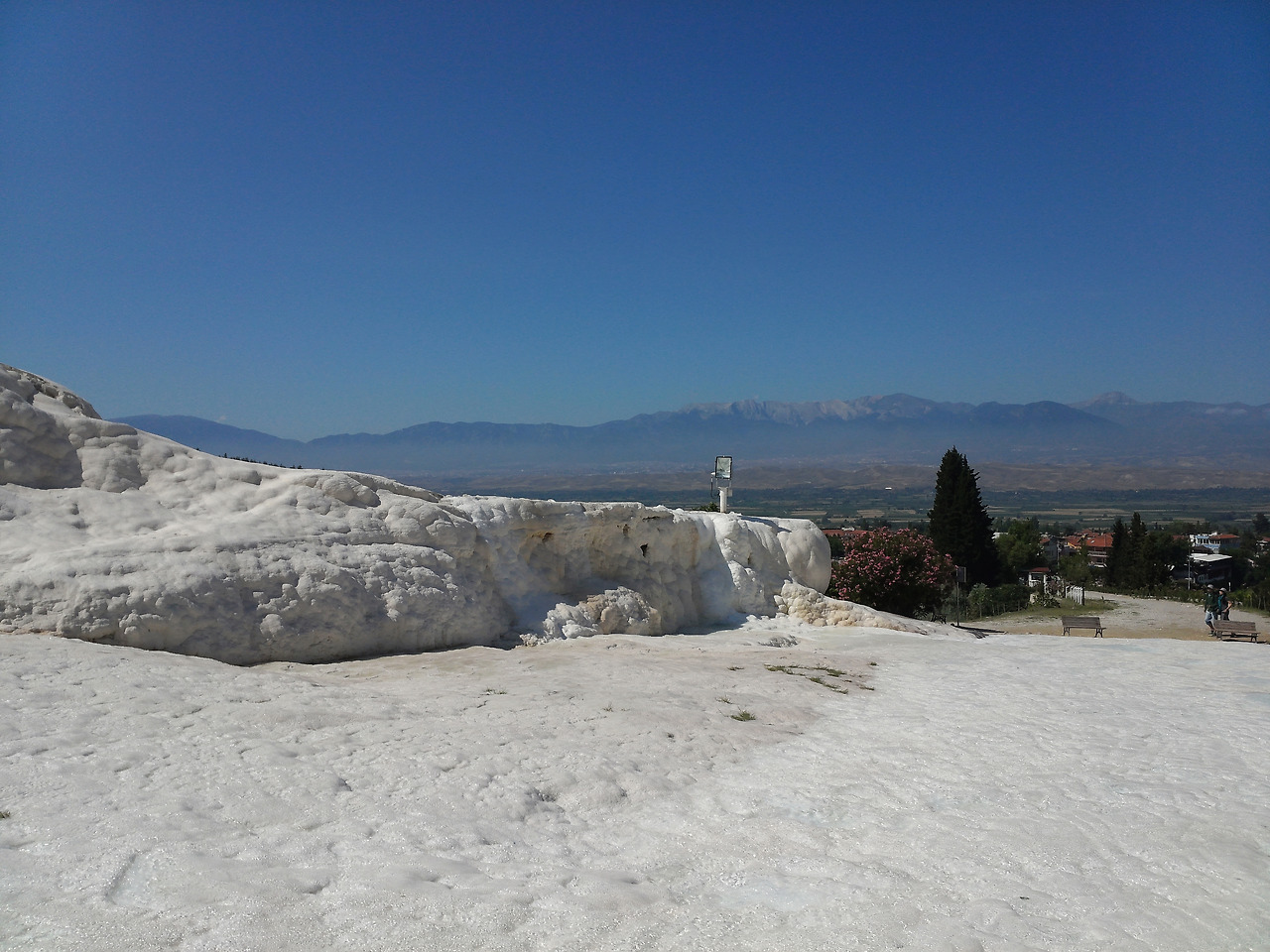 파묵칼레 모습을 폰 카메라로만 전해드려 아쉽네요. 심지어 8년 전 기종으로요. 많이 흐릿한 사진은 샤픈 효과를 주었는데도 아쉽네요. 정말 하얗답니다. 물론 유황같이 누르스름한 지역도 있지만 전체적으로 보면 설산같이, 소금같이 하얗답니다. 따뜻한 하얀 산이라 있을 거 같지 않은 풍경이 매력적인 거 같아요.