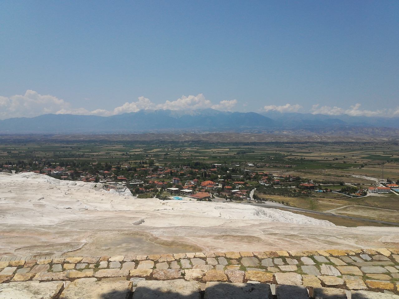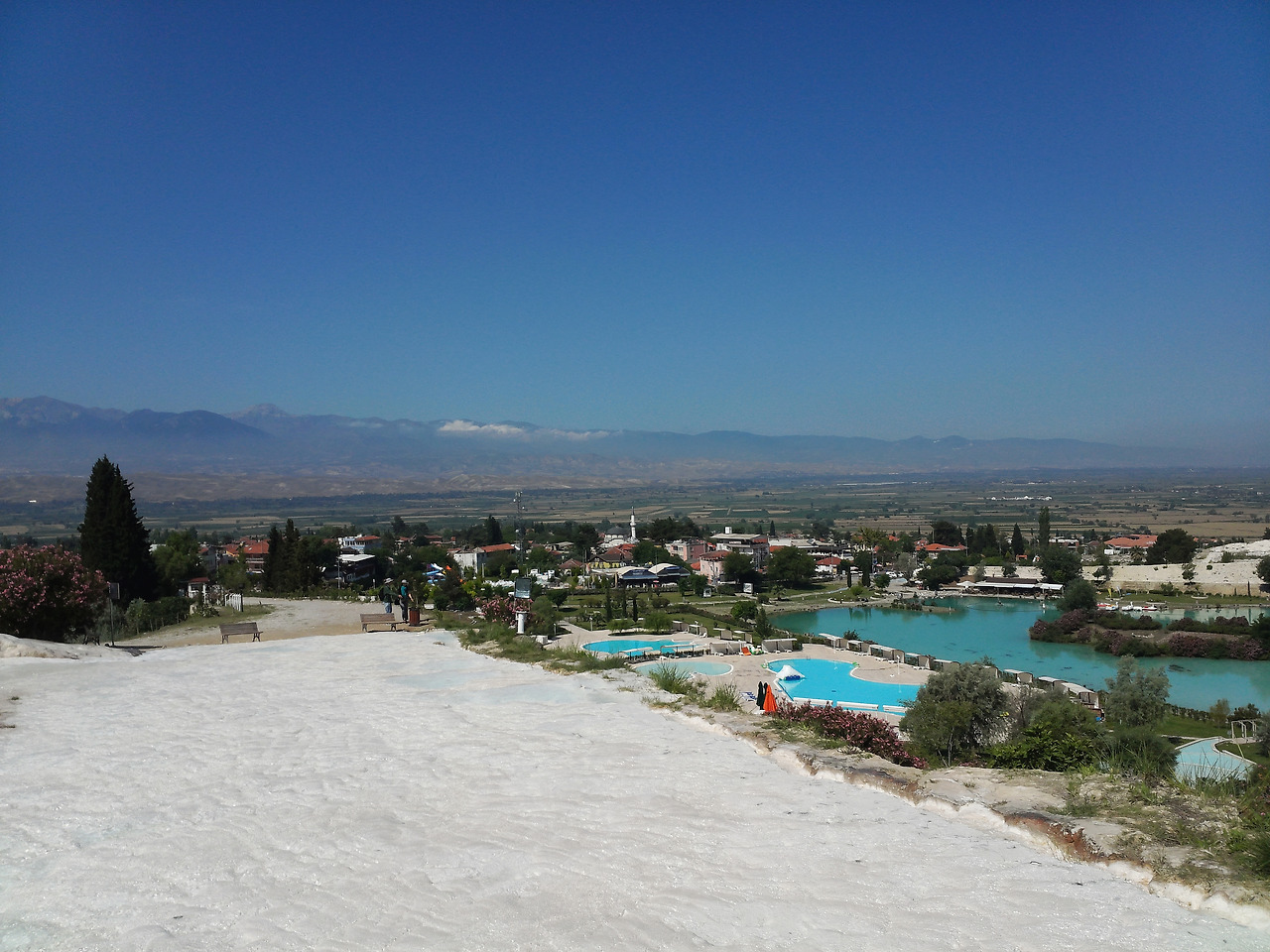 올라가면서 만져보고 냄새를 맡아보니 당연히 소금이 아니고 석회였어. 그런데 물이 투명하다니! 석회가 섞여있다면 뿌였게 되어야 하지만 입자가 얼마나 작길래 투명한 물이 되다니! 이과인이지만 신의 작품에 감탄만이 나올 뿐이었어. 입구에서 밑으로 바라보자 바로 옆에 호텔과 사람 없는 큰 수영장이 있었어. 설마 천연 수영장을 저기를 말하는 건 아니겠지?