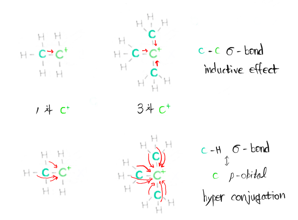 앞서 말했듯이 H-C+결합의 공유 전자도 가능하다고 했다. 그럼 H-C-C+ 결합에서 H-C결합의 공유 전자도 C+에 줄 수 있지 않을까? 이번 답도 '가능하다.'(C+의 p-obital과 상호작용) 이를 hyper conjugation(하이퍼 컨쥬게이션)이라 한다. 결론적으로 이를 단순 수치화한다면 1차 C+의 경우 1의 inductive effect와 3의 hyper conjugation의 효과를 받을 수 있으나 3차 C+의 경우 3의 inductive effect와 9의 hyper conjugation의 효과를 받을 수 있는 것이다. 이처럼 전자를 줄 수 있는 그룹을 말 그대로 electron-donating(releasing) gruop (EDG)이라 하며 앞의 두 가지 효과로 인해 C+에 EDG인 C의 결합이 많을수록 안정화되는 것이다.