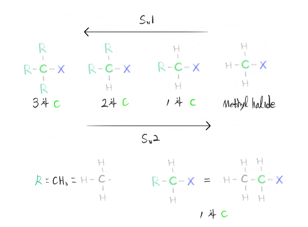 상대방인 C와 그 주위를 살펴보자. 이번에도 결과만 본다면 간단하다. 3차 C > 2차 C > 1차 C > Methyl halide (0차) 순으로 SN1반응이 선호된다. 당연히 SN2는 그 반대 순이다.(그림2) 이때, n차의 n은 C에 결합된 다른 C(탄소, Carbon)의 수이다. 즉, C의 결합된 C의 개수가 많을수록 SN1 반응이 선호된다는 것이다.