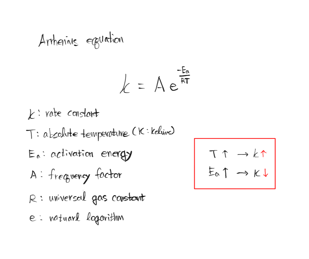 다시 처음 반응식으로 돌아와 [농도] 앞에 위치한 k를 살펴보자. k를 아레니우스 식으로 나타내면 k=Ae^((-Ea)/RT)으로 나타낼 수 있다. (k : 속도 상수, e : 자연로그의 밑, T : 절대온도, A : 빈도 R : 기체 상수(8.314J/mol K) Ea : 활성화 에너지)