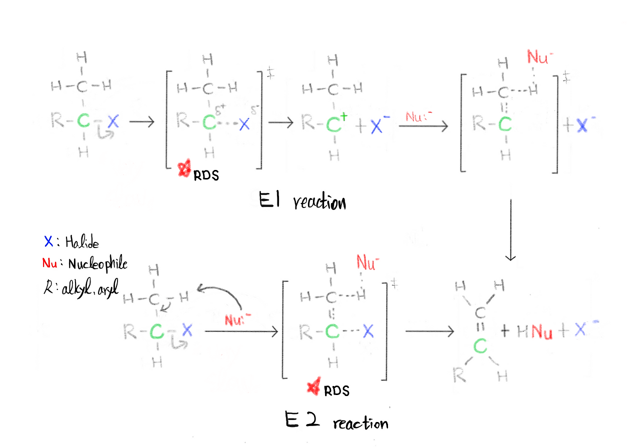 자세히 이야기하자면 온도가 높을수록 E반응이 우세, 낮을수록 SN반응이 우선된다. 새로 등장한 E반응은 elimination, 제거 반응으로 결과물이 Nu-이 X를 대체하지 않는다. X가 분리되고 Nu-이 C로 들어오는 것이 아니라 그 옆에 위치한 C의 H 하나를 데리고 감으로써 반응은 완료된다. 결과적으로 출발물질에서 X와 H가 제거되는 것이다.