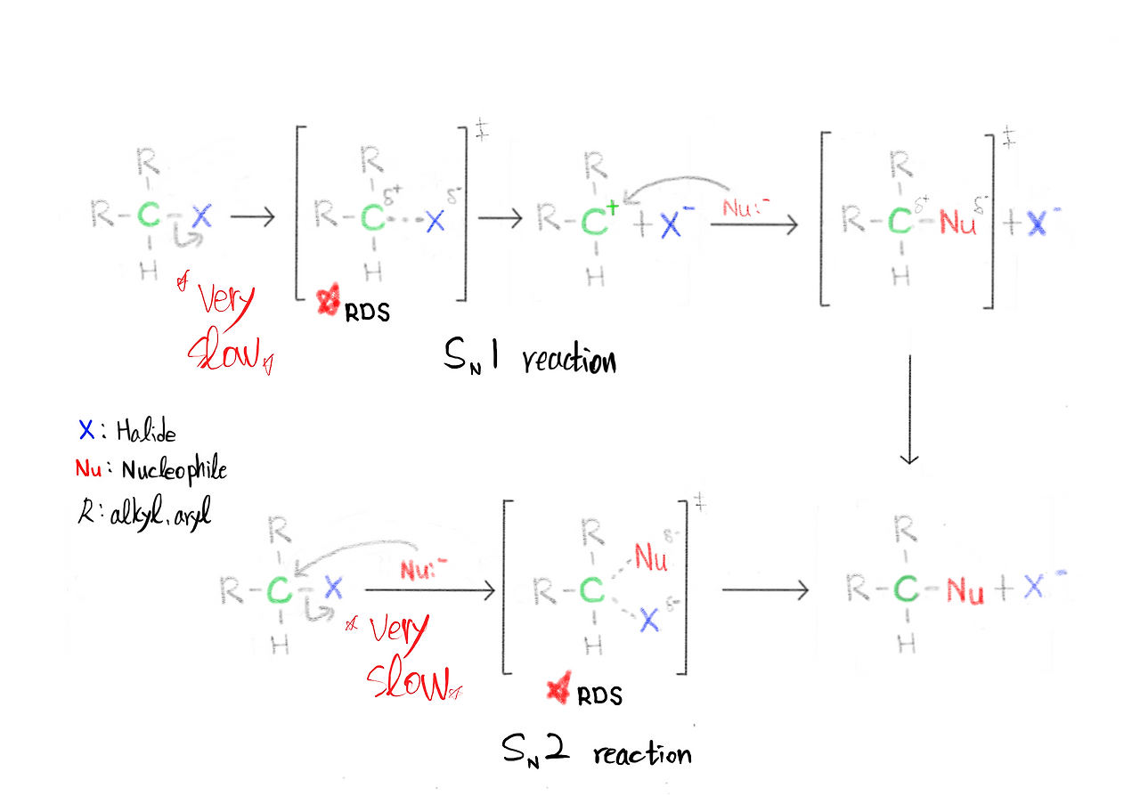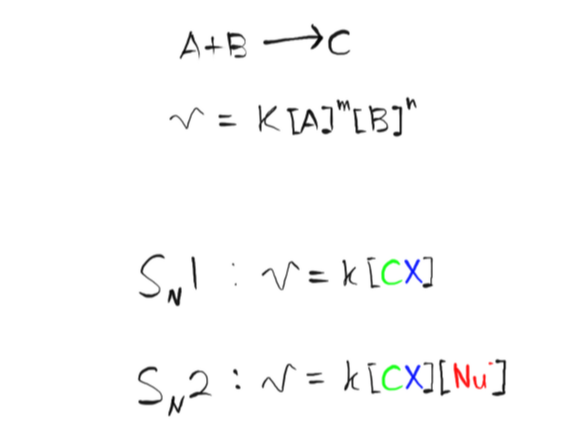 반응물 A와 반응물 B의 반응으로 결과물 C가 생성되는 반응식에서 반응 속도식을 나타내면 v = k[A]^m[B]^n이 된다.(속도 법칙, rate law, v : 속도, k : 속도상수, [A] : A의 농도, [B] : B의 농도, m : A에 대한 반응차수, n : B에 대한 반응차수) 이것을 SN1과 SN2 반응에 적용하면 SN1은 k[CX]가 되고 SN2는 k[CX][Nu-]가 된다. 이 식에서 []의 값은 농도를 뜻하는 것으로 농도가 중요한 요소라는 것을 알 수 있다.