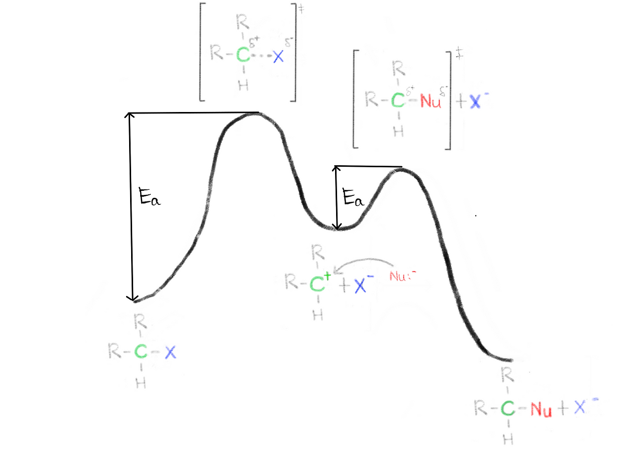 다만, 이곳에서 알아가야 할 것은 Ea (Actviation energy, 활성화 에너지)이다. 우리가 이미 접한 것으로 반응 메커니즘에서 출발 물질과 전이상태 사이의 에너지 차이, 다르게 표현한다면 전이상태로 도달하기 위한 최소 에너지를 Actviation energy라 한다. 이 이상의 에너지가 없다면 전이 상태에 도달하지 못하고 반응은 진행되지 않는다. 말 그대로 이 고비를 넘겨야 진행되는 것이다. 우리가 앞서 익힌 여러 가지 요소인 C와 결합된 R의 역할, 용매 효과 같은 요소들이 C+의 안정성을 높여줘 보다 쉽게 형성된다고 하였다. 다르게 표현하면 활성화 에너지를 낮춰줌으로써 필요한 에너지가 적게 되고 보다 쉽게 형성되는 것이다.