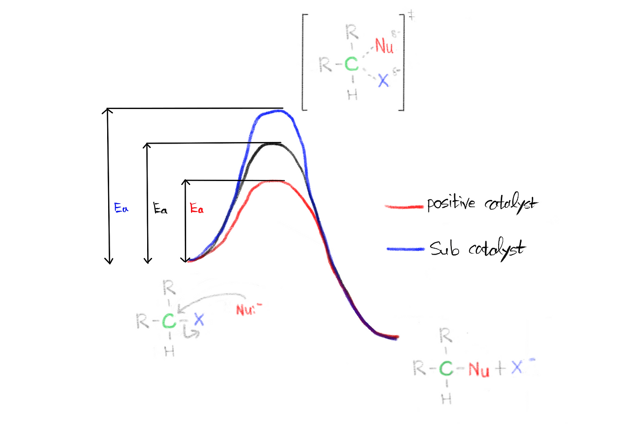 촉매는 조금 다르다. 촉매는 Ea 자체에 변화를 준다. 정촉매(positive catalyst)는 Ea를 낮춰 필요한 에너지 자체가 줄어들게 되어 속도가 증가되고 부촉매(sub catalyst)는 Ea를 높여 속도가 감소된다. 따라서 반응 경로를 따지자면 원래의 반응 경로를 바꾸는 것이다. 즉, 지름길을 만들거나 돌아가는 길을 만들어 반응에 영향을 준다.
