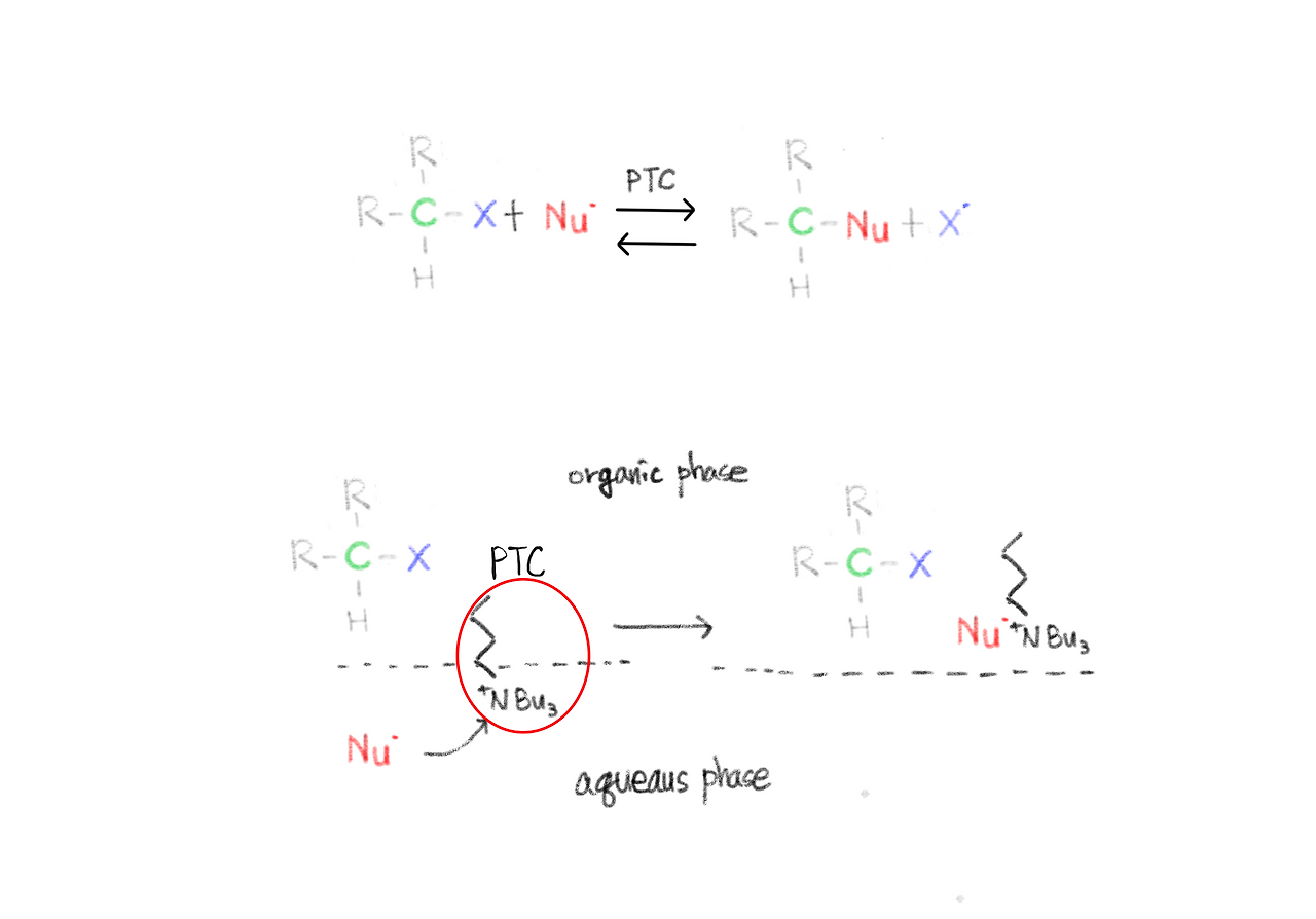 PTC란 기체, 액체, 고체처럼 혹은 물과 기름과 같이 phase(상)가 다른 물질들 속에서 transfer(전이), 혼합이 가능하게 하는 catalyst(촉매)이다. 물과 기름(유기용매)은 혼합되지 않는다. 하지만 이 촉매는 말 그대로 phase transfer 역할을 하므로 혼합되지 않는 물과 기름(유기용매) 사이에서 반응물이 이동이 가능하게 한다. 즉, 촉매로 인해 물에만 녹는 물질이 기름(유기용매)에도 녹게 되는 것이다.