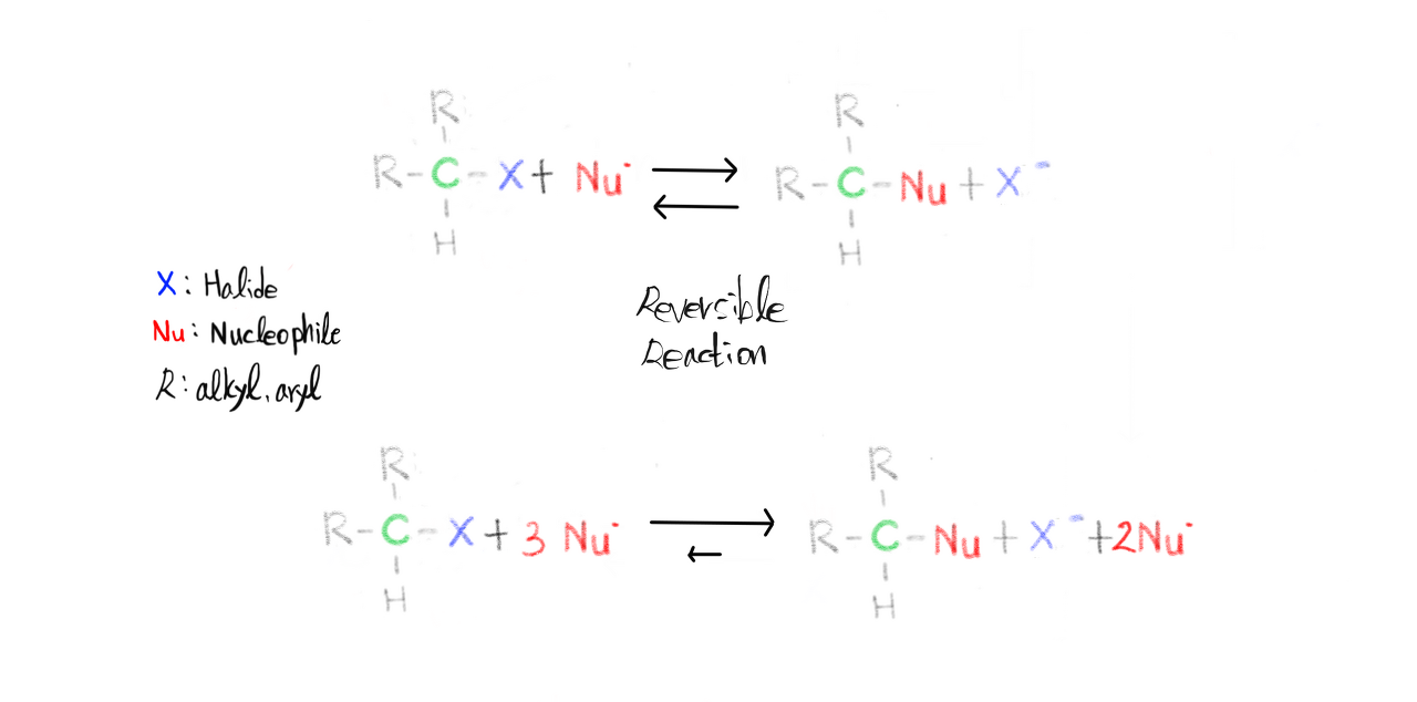 그렇다면 이때 어떻게 해야 원하는 결과물이 생성되도록 반응을 조절할 수 있을까? 답은 Nu의 농도를 C-X(출발 물질) 보다 많이 넣어 농도를 높이는 것이다. 이로 인해 역반응 보다 정반응이 빠르게 되어 결과물을 얻을 수 있다. 그림 3의 두 예시처럼 농도를 통해 반응 속도를 한쪽만 증가시켜 반응의 방향을 조절할 수 있다.