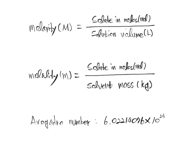 다시 몰농도로 돌아가면 몰농도(M) = 용질의 몰수 (mol) / 용액의 부피 (L)이고 몰랄 농도(m) = 용질의 몰수 (mol) / 용매의 질량 (kg)이다. 이 외에 노르말 농도(Normality)와 퍼센트 농도도 사용하나 주로 앞의 두 가지를 가장 많이 사용한다.