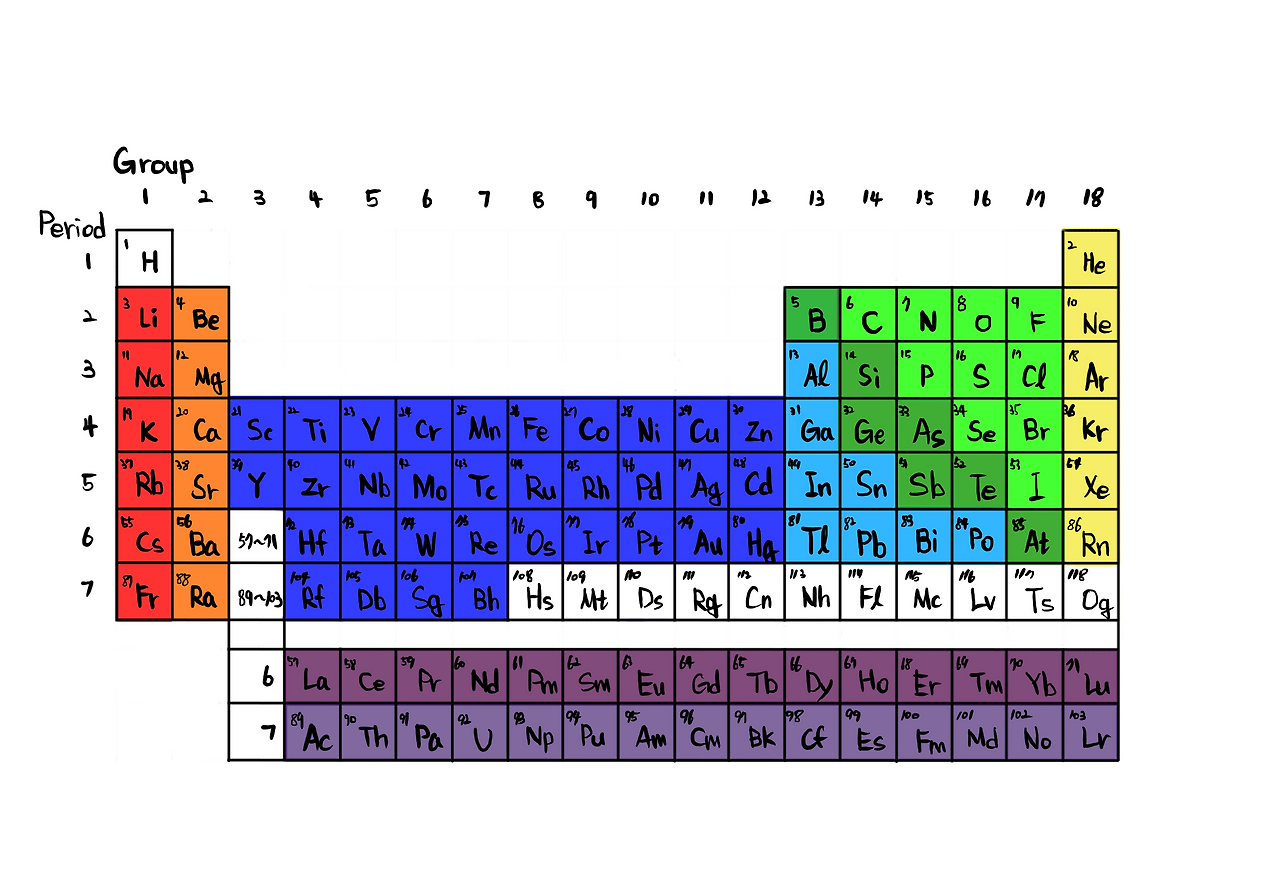 1,2 족은 s오비탈이, 3~12족은 d오비탈이, 13~18족은 p오비탈이 57~70번 원자와 90~102번 원자는 f오비탈이 가장 마지막 전자가 존재하는 오비탈(가장 바깥쪽 오비탈)이 된다. 이에 따라 원자의 특성도 달라진다. 수소를 제외한 1족은 알칼리 금속, 2족은 알칼리 토금속, 3~12족(4~7주기)은 전이금속, 18족은 비활성 기체, 4f오비탈을 채우는 57~71번 원자까지를 란타넘족, 5f 오비탈을 채우는 89~103번 원자까지를 악티늄족으로 분류한다. p 오비탈의 경우, 전이후 금속, 준금속, 비금속으로 분류된다. 이는 주기율표에서 보통 색으로 표기하는 경우가 많다.