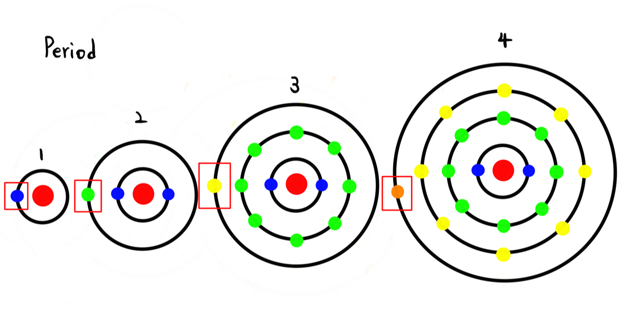 주기부터 알아보자면, 주양자수(n)와 관련 있다. 즉, 1주기는 주양자수 1의 오비탈을, 2주기는 주양자수 2의 오비탈이다. 따라서 1주기가 H(Hydrogen, 수소)와 He(Helium, 헬륨)밖에 없는 것은 주양자수가 1인 오비탈은 1s밖에 없기 때문이다. 다음 2주기는 전자가 2s, 2p오비탈까지 속하는 원자이다. 표현만 다른 말로는 전자껍질(shell)을 뜻한다고 할 수 있다. 1주기는 K 껍질(n=1), 2주기는 M 껍질(n=2), 3주기는 L껍질(n=3)......으로 말이다.