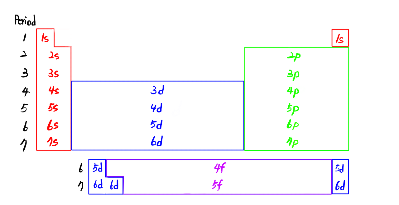 먼저, 오비탈은 에너지가 낮은 순으로 순서가 정해지는데 에너지는 주양수뿐만 아니라 각 운동량 수도 관련 있다는 것을 전자 배치 때 알게 되었다. 그래서 반드시 주양수에만 얽매이지 않아도 된다. 다만 s 오비탈의 주양자수를 보면 주기와 일치함을 알 수 있다. (1s는 1주기, 2s는 2주기......)