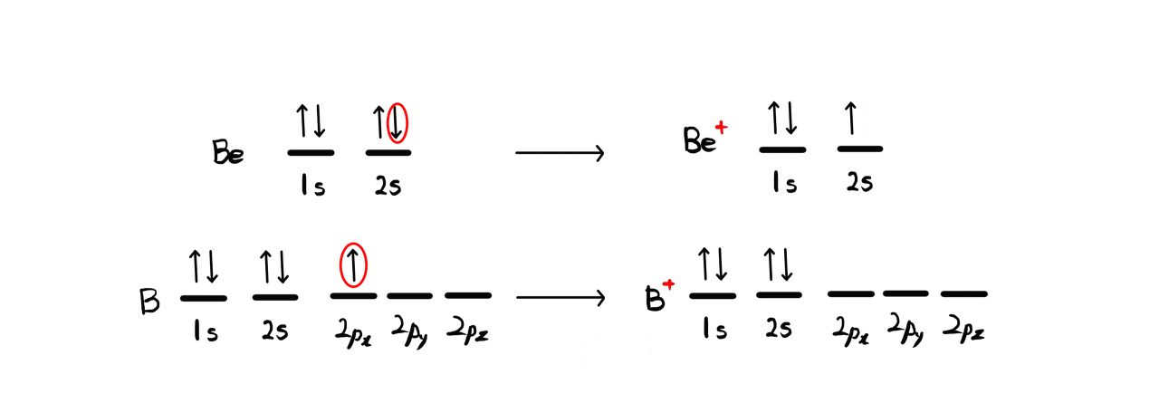 전자 배치가 끝나고 전자 하나를 제거해보면 알 수 있을 것이다. Be의 가장 바깥쪽 전자는 2s 오비탈의 전자로 두 개가 짝을 지어 가득 차 있어 상대적으로 안정된 상태에서 전자를 제거해야 하고, B의 2p 오비탈에는 전자 1개만이 있어, 이 홀전자는 제거하는데 상대적으로 작은 에너지가 든다. 무리에서 하나를 빼내기 보다 홀로 있는 하나를 빼내는 것이 쉬운 것과 비슷하다.
