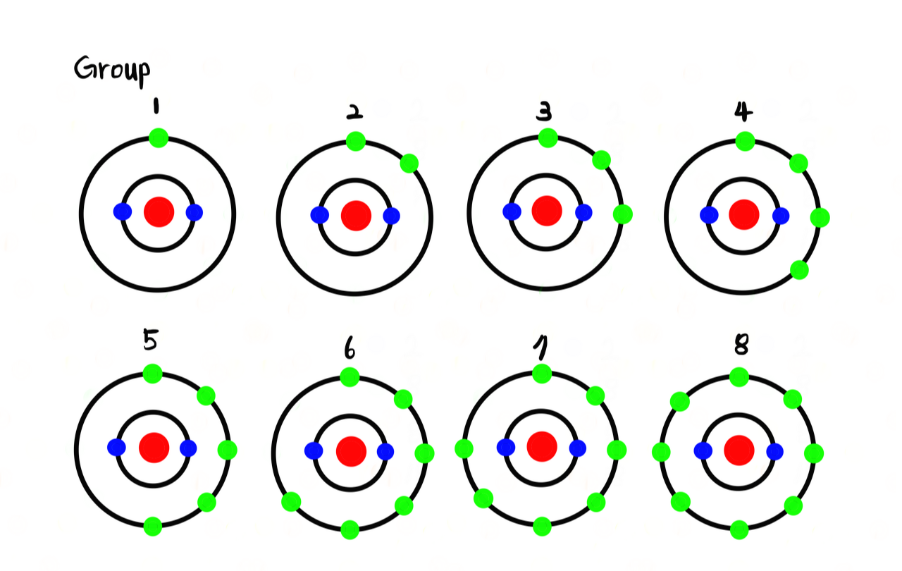그림 4. 보어의 원자 모델로 나타낸 족에 따른 원자가 전자 수(2주기)