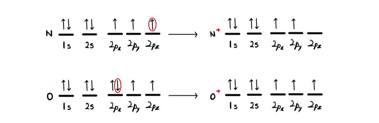 그럼 N, O는 같은 2p 오비탈임에도 불구하고 역전되는 것일까? 그것은 앞서 전자 배치에서 본 훈트 규칙 때문이다. N은 p오비탈에서 홀로 윗방향의 전자가 3개가 있으나 O는 홀로 윗방향의 전자 2개와 위 아랫방향의 짝지어진 전자가 1쌍 있다. 따라서 훈트의 규칙에 의해 짝지어진 전자끼리의 반발력이 있어 더 쉽게 제거된다. 또한 제거되면 스핀 다중도(같은 스핀의 홀전자, 홀로 윗방향의 전자)가 최대가 되므로 교환 에너지만큼 에너지가 낮아진다. 즉, O의 전자가 더 쉽게 제거될 수 있는 것이다.