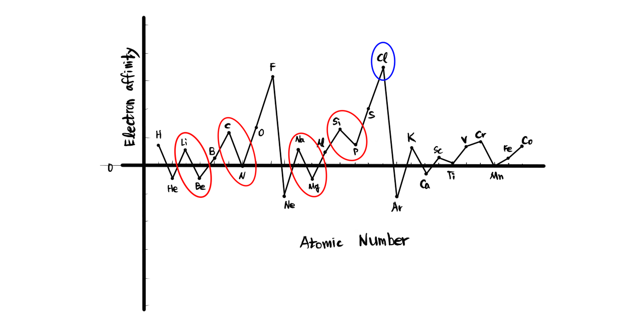 다만 주기 전체를 기준으로 2주기와 3주기 만을 볼 때 경향성이 반대로 되는데 이는 너무나 작은 원자의 크기로 인해 전자를 받았을 때 전자들의 반발력 때문에 에너지가 안정되는 양이 적다. 쿠페형 자동차의 뒷자리에는 좌석이 있더라도 사람이 들어오는 것이 힘든 것과 비슷하다.