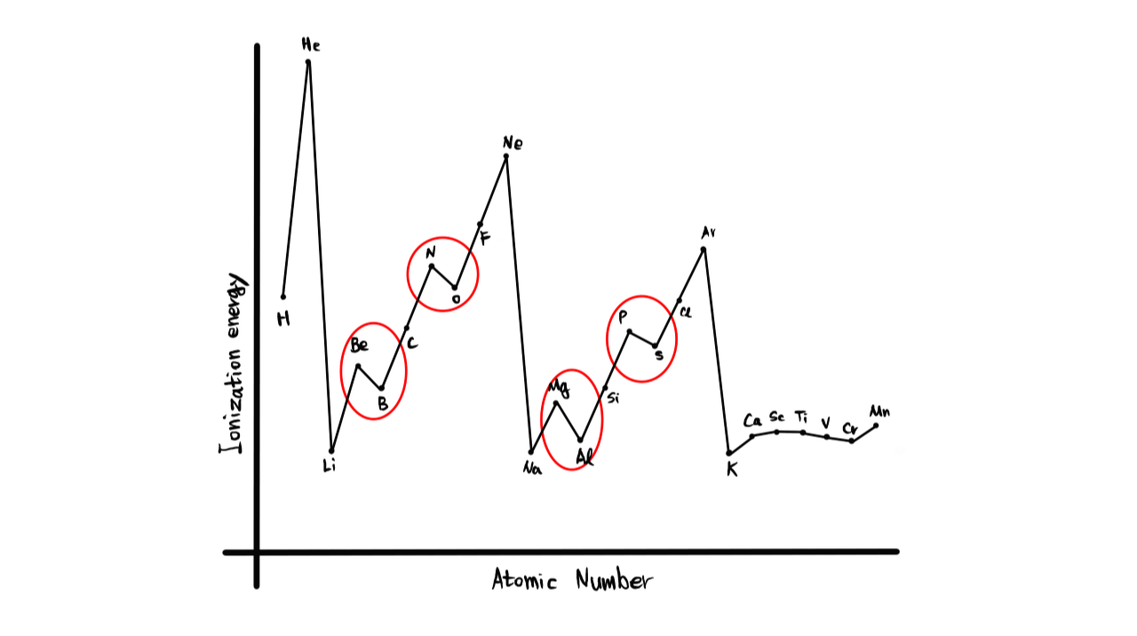 늘 예외가 있었듯이 여기에도 있다. 하지만 이유를 알고 보면 의외가 아니라 당연하게 느껴질 것이다. 2주기에서 4번 원자 Be(Beryllium, 베릴륨)과 5번 원자 B(Boron, 붕소), 7번 원자 N(Nitrogen, 질소)과 8번 원자 O(Oxygen, 산소)의 사이는 이온화 에너지 경향성이 역전된다.