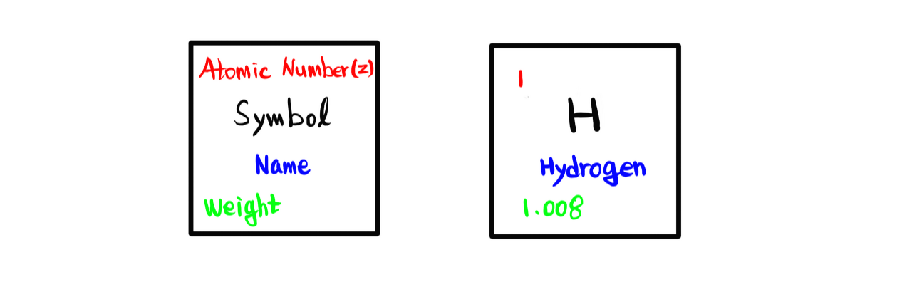 먼저 알고 가야 하는 사실이 있다. 주기율표 한 칸에는 보통 원자 번호와 원자 기호는 필수로 표기되며, 일반적으로 원자 이름과 원자량(무게)까지 표기한다. 추가적으로 전자 배치, 오비탈, 산화수까지도 표기하기도 하고 더 많은 정보를 넣기도 한다.