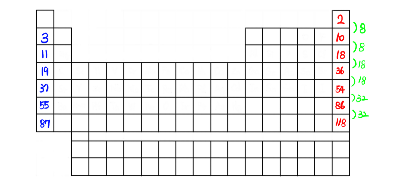 그림 7. 1족 원소의 전자 수(파란색), 18족 원소의 전자 수(빨간색), 18족 원소끼리의 전자 수 차이(초록색)