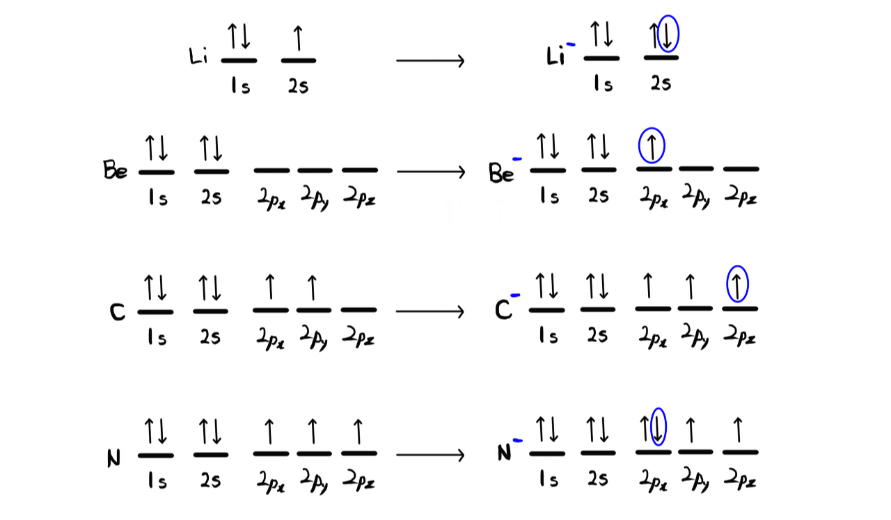 그림 15. Li, Be, C, N의 음이온 전자 배치