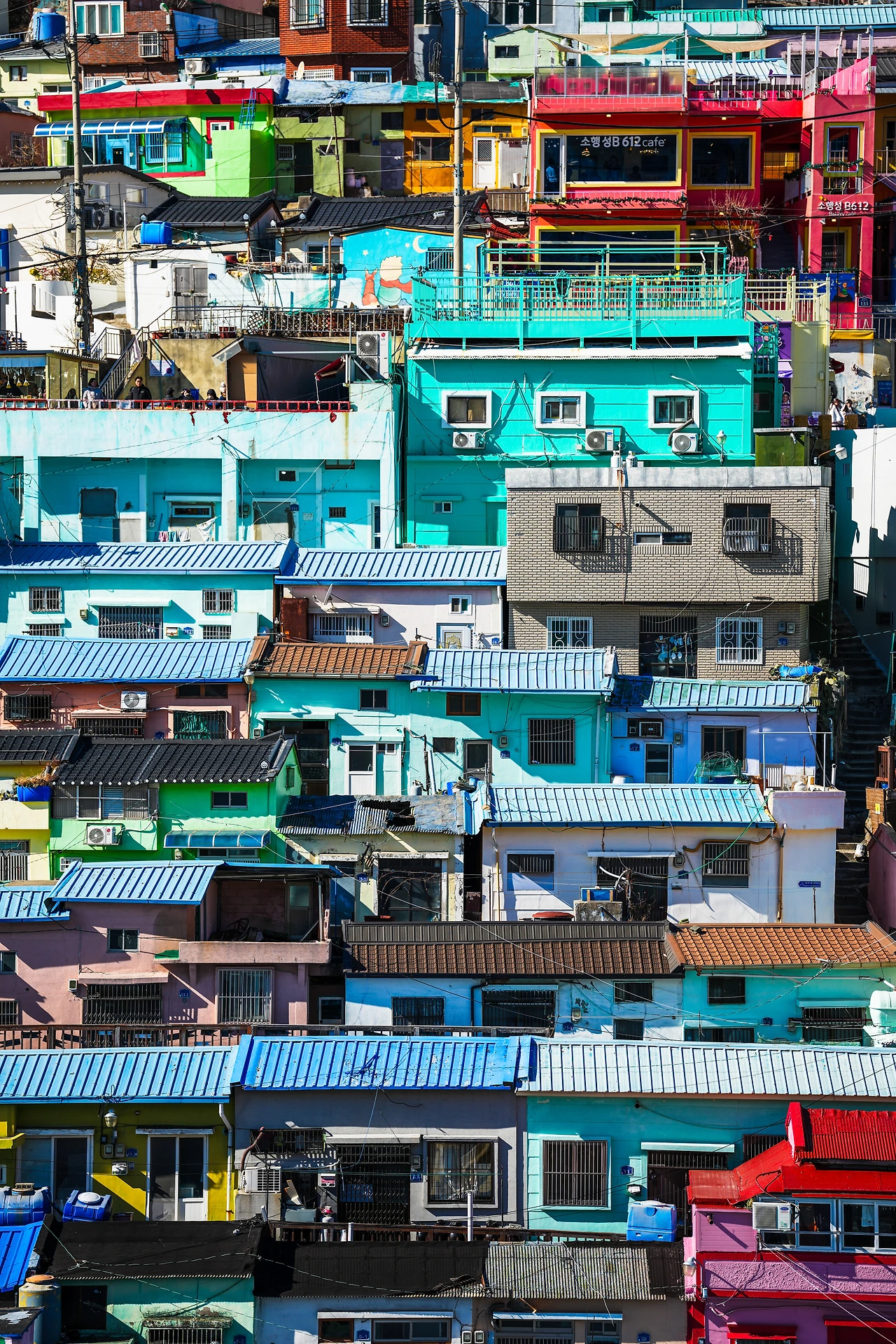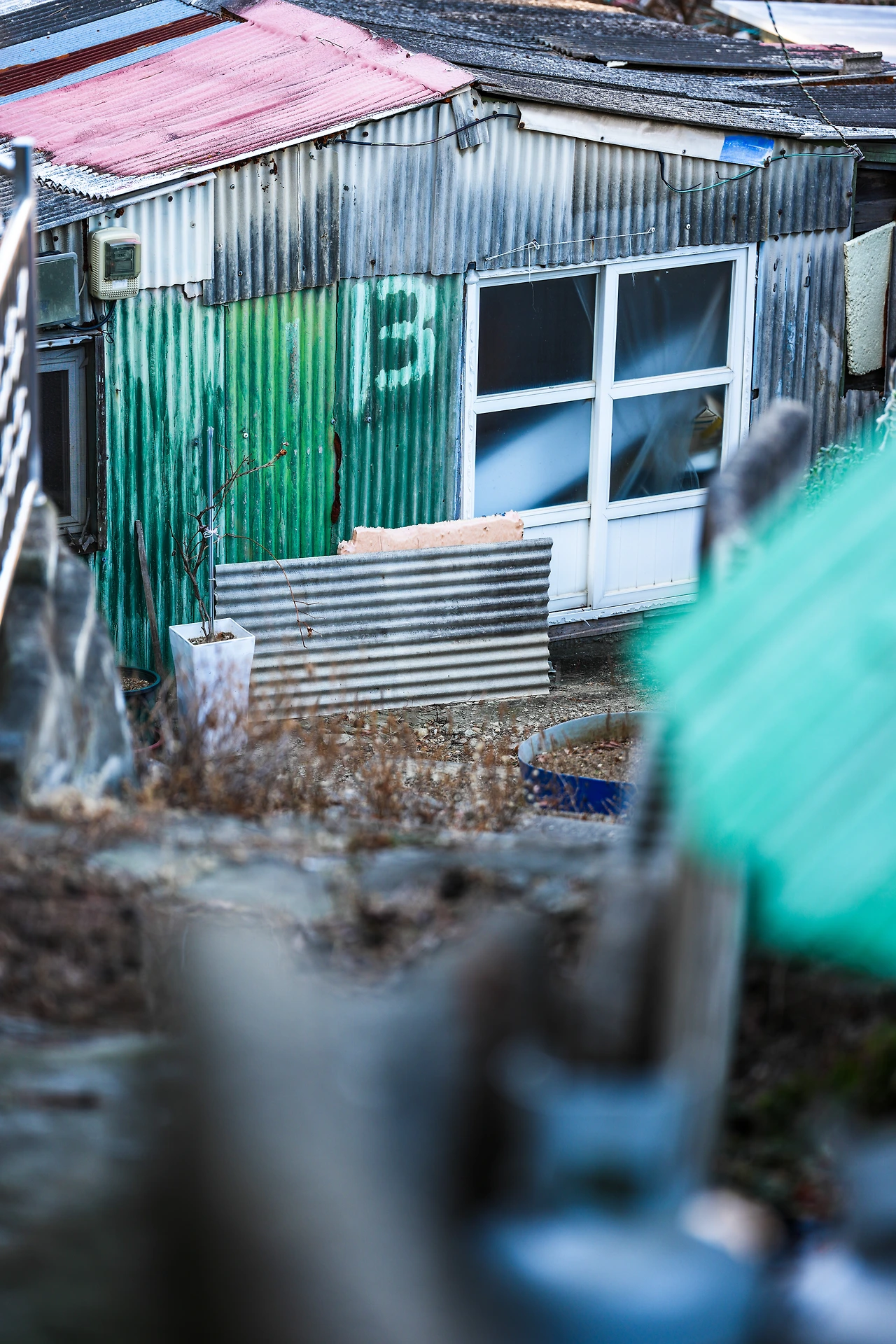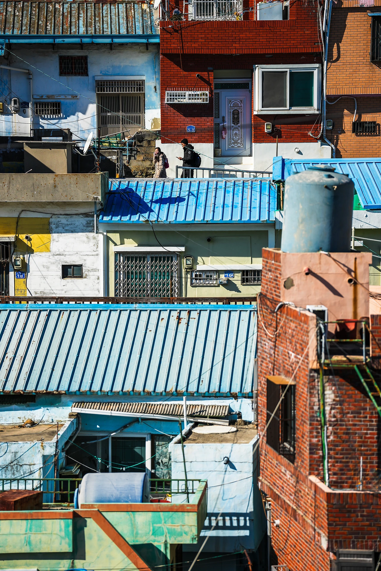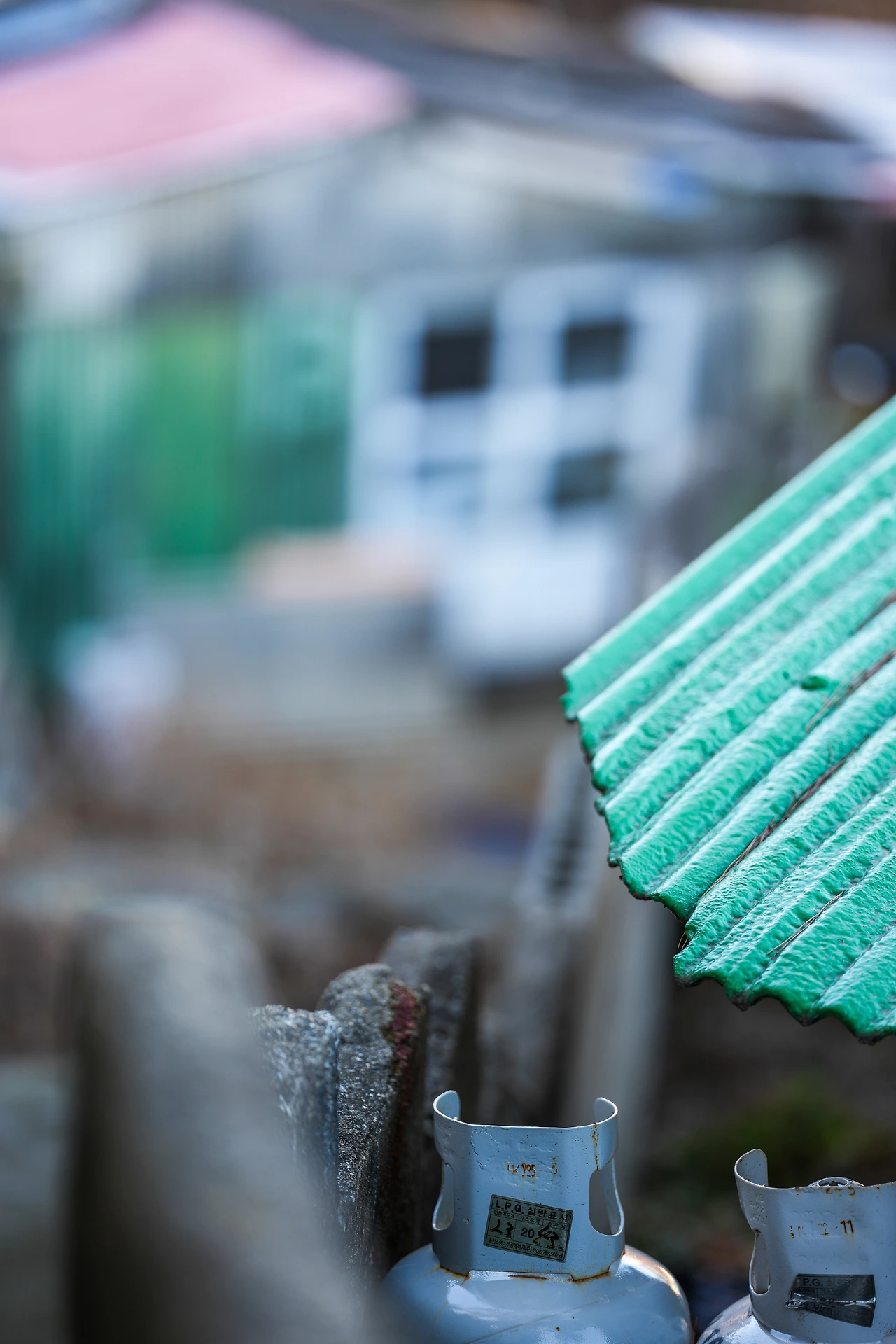 감천 문화마을은 넓고, 복잡하고, 산만하다. 하지만 135mm로 잘라내면 이야기는 달라진다. 많은 것들 중 일부만 남고 남은 것들은 서로 밀착되어 하나의 이미지가 된다. 겹겹이 쌓인 집들은 실제로는 서로 꽤 떨어져 있다. 하지만 135mm로 바라보면 그 거리는 사라진다. 앞뒤의 간격은 눌리고, 색과 형태만 남는다.