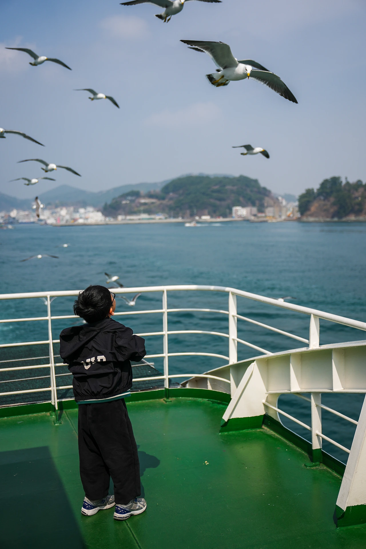배를 탔지요. 통영에서 한산도 이충무공유적에 가기 위해서였습니다. 배가 출발하기 전에 배 제일 위로 올라가 봤습니다. 그런데 전혀 기대하지 않았던 새들을 만났습니다. 갈매기들이었는데 사람들이 새우깡을 던지고 있었지요.