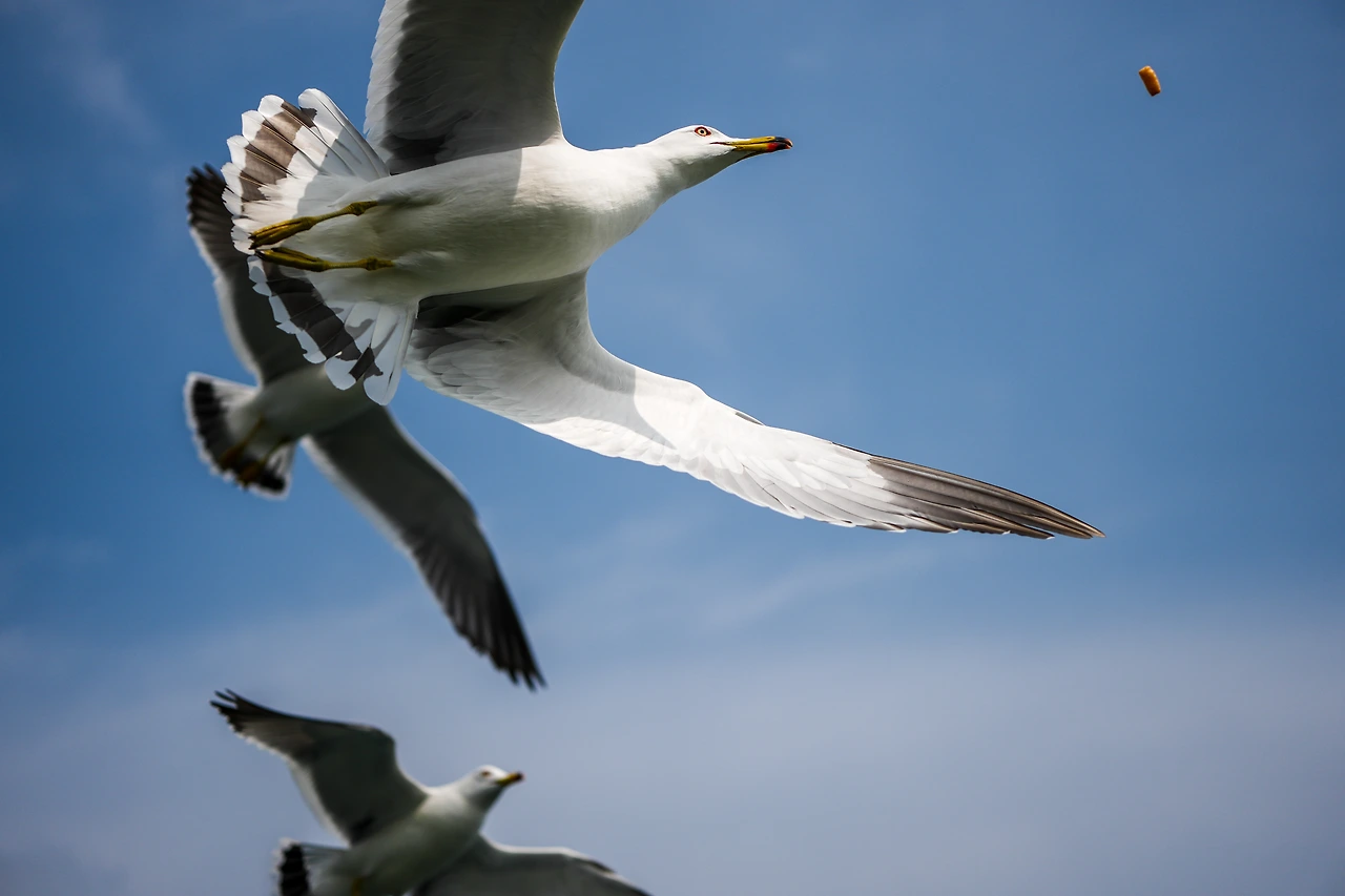 비교적 높은 곳에서 날아가는 모습으로 과자를 받아먹는 모습이었습니다. 그래서 이 사진은 마치 하늘을 날아가며 새우깡을 먹는 것처럼 보입니다. 또 통영에 가면 이런 갈매기들을 만나고 싶다는 생각이 들더라고요.