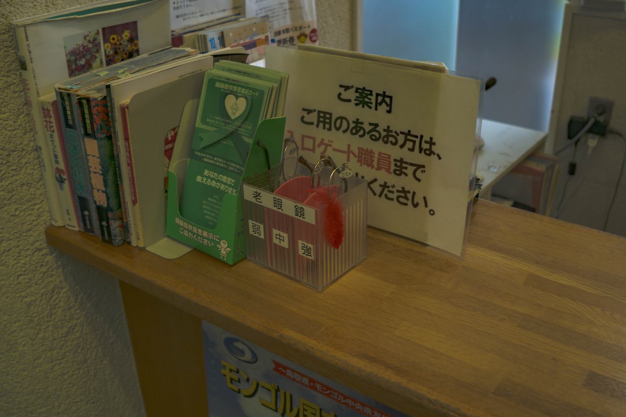 정갈하게 놓여 있는 팸플릿과 어르신들이 많은 일본에 항상 구비되어있는 노안 안경
